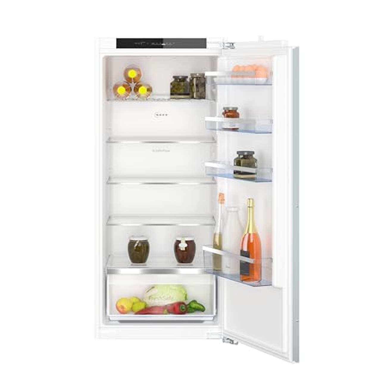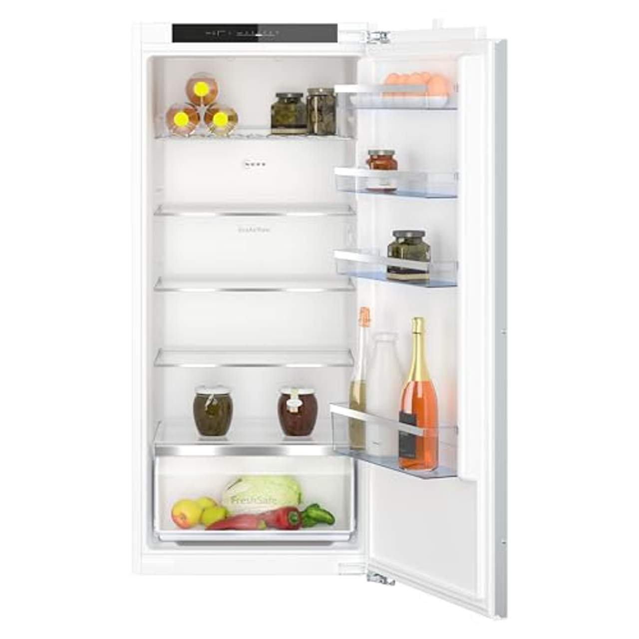 Neff KI1412FE0 Einbaukühlschrank N50Flexible Lagermöglichkeiten für frische Lebensmittel.Obst und Gemüse wünschen sich einen eigenen Platz im Kühlschrank. Darum bietet Ihnen die Fresh Safe-Schublade den optimalen Platz, an dem Sie frische Lebensmittel aufbewahren und im Handumdrehen finden können.Höhenverstellbare BödenMit den höhenverstellbaren Böden schaffen Sie genau den Platz, den Ihre Zutaten jetzt brauchen - immer wieder.Frische Luft für ein besseres Kühlergebnis.Sie wählen Ihre Lebensmittel liebevoll aus? Unser Eco Air Flow-System behandelt sie anschließend genauso liebevoll. Dazu verteilt es die Luft im Kühlschrank gleichmäßig, um für eine konstante Temperatur zu sorgen.So bleibt alles knackig-köstlich-frisch.Ihr Kühlschrankinnenraum im neuen Licht.Die flachen, langlebigen LED-Leuchten erhellen Ihren Kühlschrank von oben bis unten und vorne bis hinten. Dabei sehen Sie nicht nur alles, sondern sparen auch Strom, weil sich LED-Leuchten nicht erwärmen.Da strahlt nicht nur ihr Kühlschrank!SicherheitsglasSie können gar nicht genug Leckereien zu Hause haben? Für unser Sicherheitsglas ist das ein Klacks - kühlen Sie auch große und schwere Zutaten ein, ohne sich auch nur einen Gedanken um das Gewicht auf den Sicherheitsglassböden zu machen.