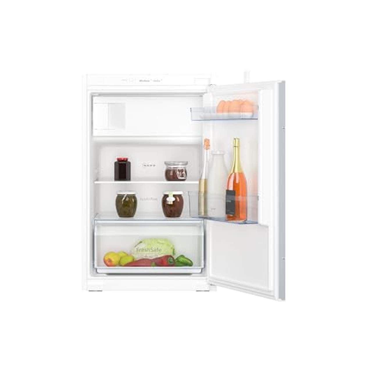 integrierbarer KühlautomatDer integrierbare Einbaukühlschrank »KI2221SE0« ist von der Marke NEFF. Bei einem Gefriervolumen von 15 l und Kühlvolumen von 104 l betragen die Maße des Modells 56 x 88 x 54,8 cm (B/H/T). Damit eignet es sich insbesondere für eine Person oder als Zweitgerät. Das Modell arbeitet mit einem Betriebsgeräusch von 35 dB. Es ist eine Gemüseschublade und ein Gefrierfach mit Klappe zum Verstauen des Einkaufs integriert. Die zwei Ablageflächen aus Sicherheitsglas, darunter eine höhenverstellbar, bieten viel Platz für Lebensmittel.Die zwei Türablagen ermöglichen eine übersichtliche Lagerung. Die Supergefrier-Funktion sorgt dafür, dass sich die Lebensmittel besonders schnell kühlen und einfrieren lassen. Wenn die Tür zu lange offen steht, macht der Einbaukühlschrank über ein akustisches Warnsignal darauf aufmerksam.Dank der LED-Innenbeleuchtung findet man ganz problemlos, was man sucht. Wer auf der Suche ist nach einem Modell, das ausreichend Platz für Nahrungsmittel bietet, der trifft mit dem »KI2221SE0« von NEFF eine gute Wahl.