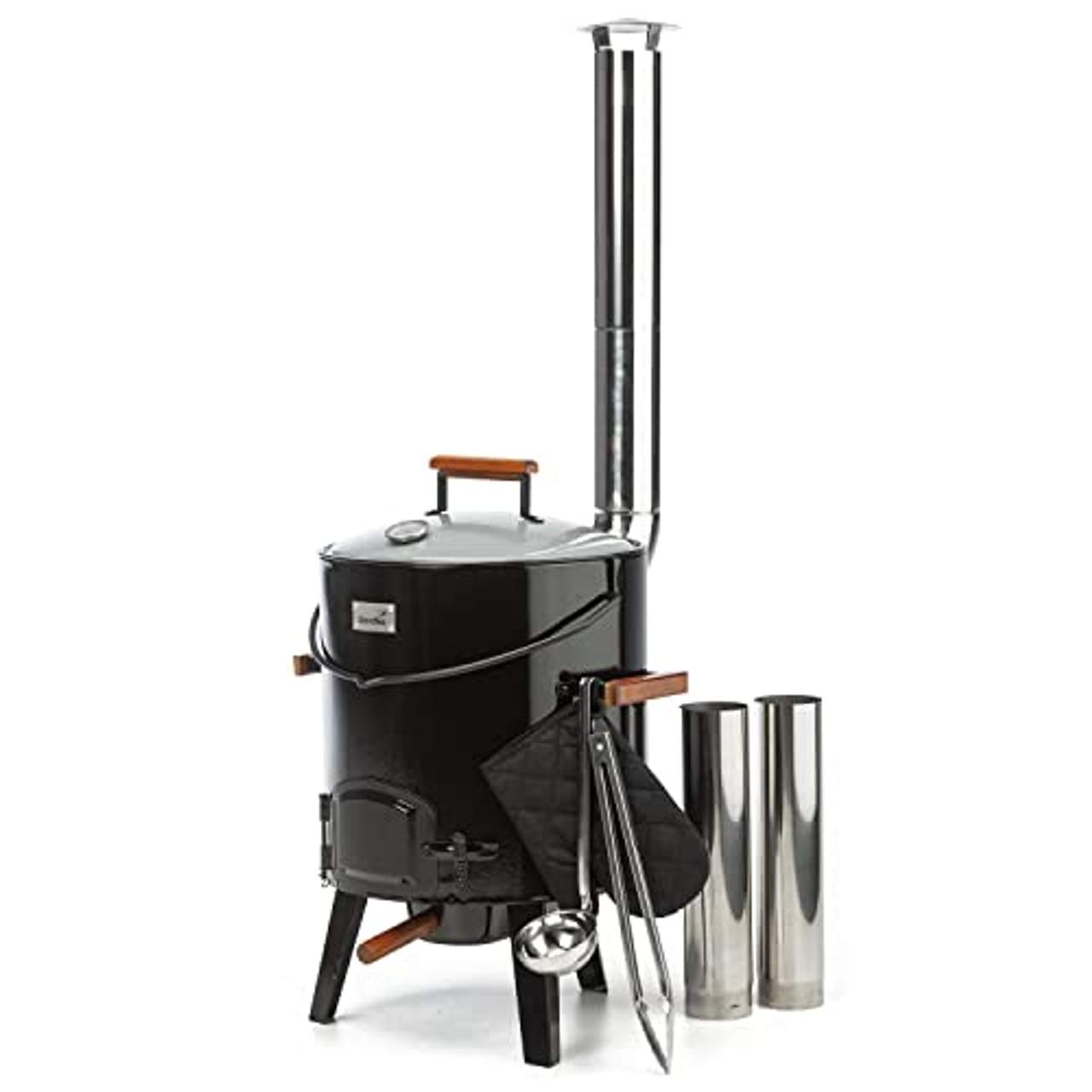 Dieses Modell wurde für den Einsatz im Freien entwickelt, so dass seine relativ große Größe weniger ein Problem darstellt als bei einem Gerät für den Innenbereich. Das verstellbare Schornsteinrohr mit Regenschutz sorgt für einen rauchfreien Betrieb und ermöglicht es dir, bei verschiedenen Wetterbedingungen bequem und sicher zu kochen. Das deutet auf ein durchdachtes Design hin und darauf, dass die Skandika Gulaschkanone deinen Stew-Ofen-Test mit Bravour bestehen könnte.