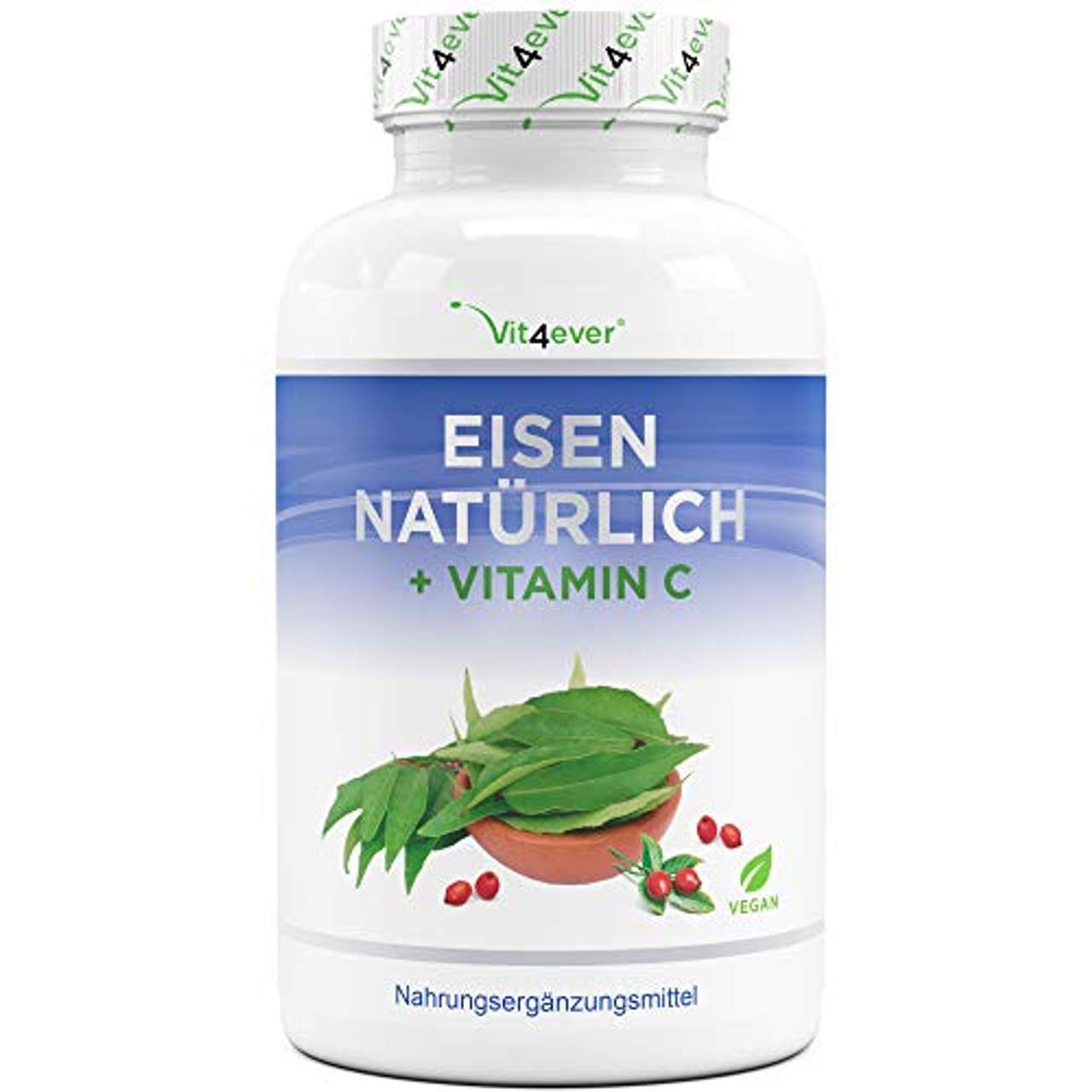 Vit4ever Natürliches EisenVit4ever Eisen + Vitamin C Eisen ist nicht nur eines der wichtigsten aber auch eines der häufigsten Spurenelemente in unserem Körper. Mineralstoffe und Spurenelemente sind generell wichtige Nähr,- und Vitalstoffe, jedoch erhält Eisen seine besondere Bedeutung aufgrund seiner Hauptfunktion, nämlich dem Transport von Sauerstoff, sowie auch dem Energiestoffwechsel. Eisen bindet nämlich den Sauerstoff an das Hämoglobin und sorgt somit für die Sauerstoffversorgung in unserem Blutkreislauf.Eine nicht ausreichende Aufnahme von Eisen über die Nahrung kann zu Eisenmangel führen, was nichts anderes bedeutet als das uns schlichtweg die Kraft und uns die Energie ausgeht. Die unangenehmen Folgen von Eisenmangel können Müdigkeit, Kopfschmerzen, Schwächeanfälle, Atemnot, Konzentrationsschwäche und auch übermäßig trockene und rieselnde Haare sein.Nahrungsergänzungsmittel wie zum Bsp. Eisentabletten oder Eisen Kapseln können einem solchen Mangel entgegenwirken und körpereigene Stoffwechselprozesse wohltuend unterstützen. Natürliches Eisen kann von unserem Körper am Besten in der Kombination mit Vitamin C aufgenommen werden. Das Vitamin ist ein Förderer der Eisenresorption und wandelt das Spurenelement von 3-wertigem zu 2-wertigem Eisen um, welches vom Körper schneller und besser aufgenommen werden kann. Unsere Eisen-Kapseln werden nach europäischen Qualitätsstandards (DIN EN ISO 9001 und HACCP-Konzept) hergestellt und wie bei allen Nahrungsergänzungsmitteln von Vit4ever, legen wir stets großen Wert darauf, dass bei der Produktion ausschließlich natürliche Premium Rohstoffe verwendet werden.Highlights auf einen Blick: In jeder Dose befinden sich 180 Eisen-Kapseln für einen praktischen 3 Monatsvorrat. Jede Tagesportion von 2 Kapseln versorgt ihren Körper mit 28 mg natürlichem Eisen und 160 mg Vitamin C Entgegen herkömmlicher Eisenpräparate gewinnen wir unsere Wirkstoffe ausschließlich aus natürlichen Quellen und unsere Kapseln enthalten dank Curryblatt-Extrakt & Hagebutte-Extrakt rein pflanzliches Eisen bzw. Vitamin C Nahrungsergänzungsmittel in Form von Kapseln mit einem Eisen Komplex können dabei helfen Schlappheit, Müdigkeit und allgemeines Unwohlsein aufgrund von Eisenmangel zu bekämpfen und zu lindern Durch die Kombination mit natürlichem Vitamin C aus der Hagebutte + Leinsamenmehl, welches Omega-3 Kerne enthält kann das Eisen besonders gut vom Körper aufgenommen & verarbeitet werden Wie wirken Eisen + Vitamin C? Wie bereits erwähnt nimmt das Spurenelement Eisen eine bedeutende Schlüsselfunktion für den Sauerstofftransport, als auch für den Energiestoffwechsel ein. Betrachtet man die Wirkung des Mikronährstoffes genau, trägt es zu einer normalen Bildung der roten Blutkörperchen und Hämoglobin bei.Weiterhin verringert Eisen Müdigkeit und trägt zu einer normalen kognitiven Funktion bei. Weitere wohltuende Wirkungen sind der Beitrag zu einer normalen Funktion des Immunsystems und der Zellteilung im Körper. Darüber hinaus ist Eisen sehr wichtig für die Entwicklung der Wahrnehmungsfähigkeit bei Kindern.Vitamin C trägt ebenfalls zu normalem Stoffwechsel bei, stärkt das Immunsystem, schützt Zellen vor oxidativem Stress und hat zudem positive Eigenschaften auf die Bildung von Haut, Knochen, Knorpel und Zähnen. 100 % natürliches Eisen Für das Eisen in unseren Kapseln verwenden wir ausschließlich Curryblatt-Extrakt aus Indien. Diese rein natürliche Form des Eisens ist pflanzlich gebunden und gilt folglich als sehr schonende und gut verträgliche Eisenquelle. Unangenehme Nebenwirkungen wie sie oft bei synthetisch hergestellten Eisenpräparaten vorkommen, spielen bei unseren 100 % natürlichen Kapseln keine Rolle. Neben der rein pflanzlichen Quelle an Eisen, liefert das indische Curryblatt zudem viel natürliches Vitamin C in Form von Fruchtextrakten wie Amla- und Acerola Extrakt. Auch wurde dem natürlichen Curryblatt-Eisen schon mehrmals nachgewiesen, dass es im Gegensatz zu herkömmlichen Eisenpräparaten wie Eisen-II-Gluconat nicht nur eine bessere Verträglichkeit, sondern auch eine bessere Resorption des Wirkstoffes besitzt.