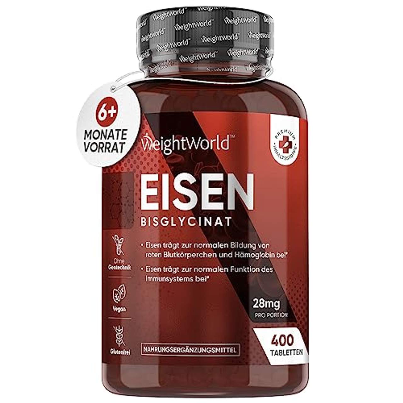 WeightWorld Eisen TablettenEisen Bisglycinat mit hoher Bioverfügbarkeit - Eisen Bisglycinat ist ein Eisen-Aminosäure-Chelat. Es wird durch die Reaktion von Eisen mit zwei Molekülen der Aminosäure Glycin in einem Prozess gebildet, der Chelatbildung genannt wird. Eisen kann durch die hohe Bioverfügbarkeit besser vom Körper aufgenommen werden.Die Tabletten sind leicht zu schlucken (6,35mm groß). So können Sie einfach Ihren Eisenbedarf decken. Funktion von Eisen - Eisen ist ein wichtiges Spurenelement für den Körper. Hinsichtlich der EFSA Angaben trägt Eisen zur normalen Bildung von roten Blutkörperchen und Hämoglobin sowie zum Sauerstofftransport im Körper bei. Eisen trägt zu einer normalen kognitiven Funktion und einem Energie Stoffwechsel bei.Außerdem trägt Eisen zur normalen Funktion des Immunsystems bei und spielt eine Rolle im Prozess der Zellteilung. Eisen kann Müdigkeit und Erschöpfung verringern. Langanhaltende Unterstützung mit Eisen - Unsere WeightWorld Eisentabletten enthalten reines Eisenbisglycinat, ein besonderes Spurenelement. Die Tabletten enthalten 28 mg Eisen pro Portion. Sie können das reine Eisen für Ihren individuellen Bedarf nutzen. Wir bieten Ihnen 400 Tabletten für mehr als 6 Monate Vorrat. Nehmen Sie täglich zwei Tabletten mit Wasser ein und am besten mit Vitamin C. Sie sind für Frauen und Männer geeignet. Vegan & Nachhaltige Verpackung - Für uns steht Qualität an erster Stelle. Unsere Tabletten sind frei von Gluten, Laktose, Aromen, Farbstoffen, Allergenen und selbstverständlich ohne Gentechnik oder Tierversuche hergestellt. Unsere Produkte sind klimafreundlich und wir verwenden recycelbare Verpackungen, um so unsere CO2 Emissionen zu reduzieren.Außerdem werden sie gemäß GMP Standards unter strengen europäischen Richtlinien hergestellt.