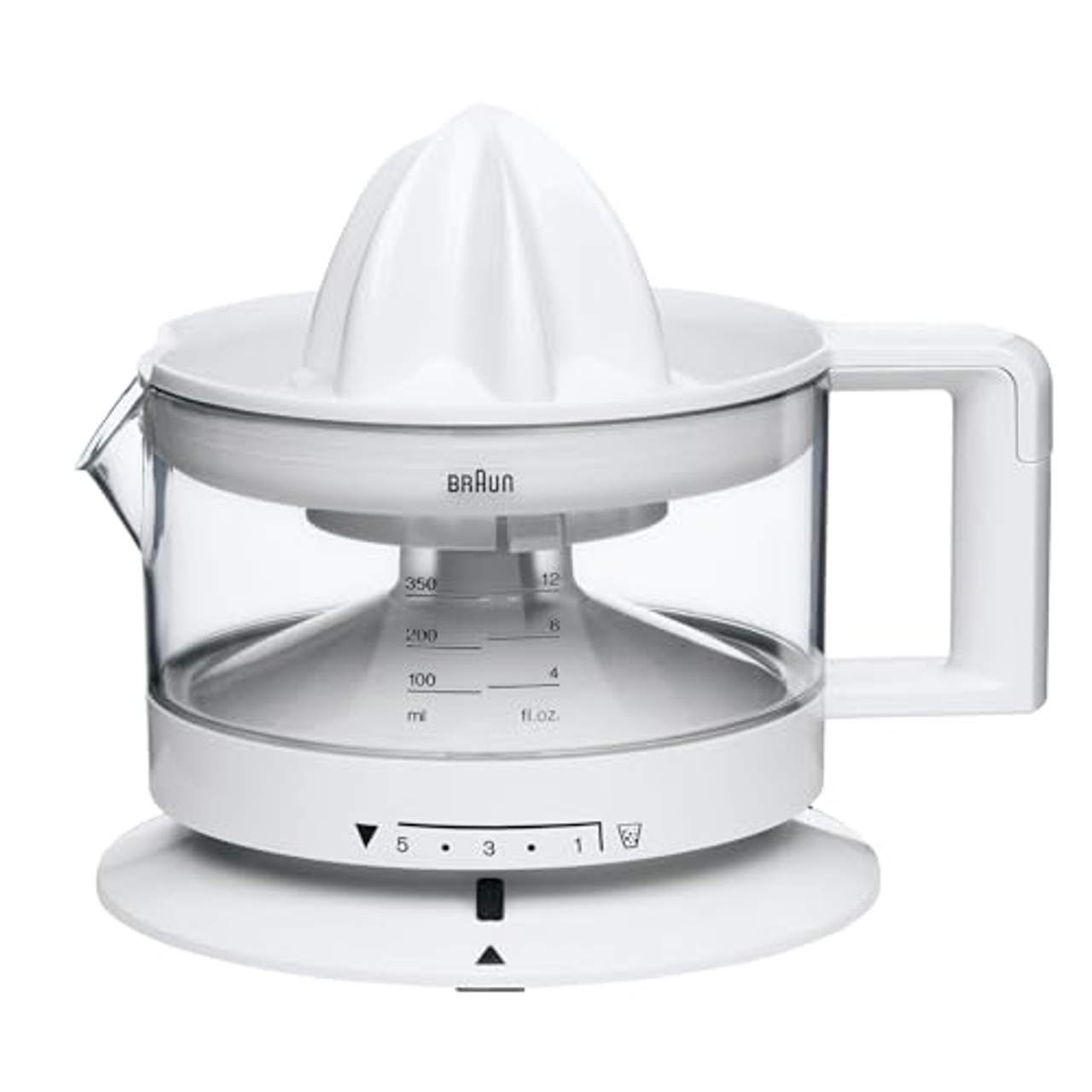 - Kompaktes Design: Die Braun CJ3000 Tribute Collection Zitruspresse electric bietet mit einem Fassungsvermögen von 0,35 l ausreichend Platz für den Saft und ist dabei leicht und handlich. Dank ihrer neutralen Farbe passt sie außerdem in jede Küche.