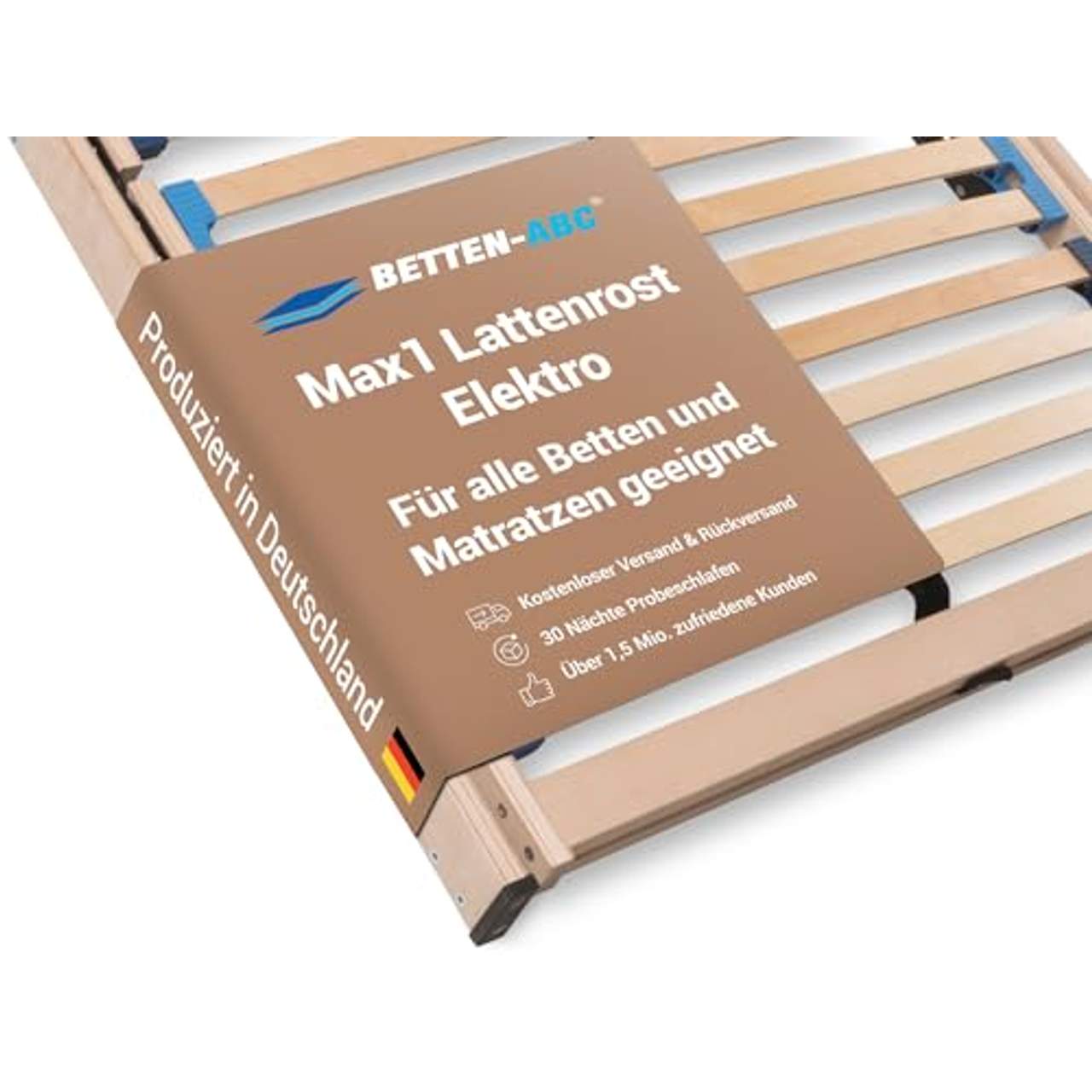 Elektrischer Lattenrost Betten-ABC Max1 ElektroDer Lattenrost Max1 Elektro besteht aus stabilem Schichtholz, ist bis ca.150 kg belastbar und ermöglicht den Kopf- und Fußbereich elektrisch zu verstellen. Zusätzlich gibt es die Möglichkeit der individuellen Härtegradverstellung im Mittelzonenbereich. Lattenrost Max1 Elektro im Detail:Elektrisch verstellbarer Lattenrost mit Funkfernbedienung Zweimotoriger Antrieb inklusive Notabsenkung durch integrierte Batterie Individuelle Härtegradverstellung im Mittelzonenbereich Bis ca. 150 kg belastbar 26 flexible, mehrfach verleimte Federholzleisten bei 190 cm Länge 28 flexible, mehrfach verleimte Federholzleisten bei 200 cm Länge Für alle Matratzen geeignet, da Lattenabstand nur ca. 3 cm Nicht geeignet für Betten mit zwei Quertraversen Flexible Abfederung durch bewegliche, aufliegende Duo-Kappen aus Kautschuk Rahmenhöhe ca. 6 cm, Gesamthöhe ca. 20 cm Benötigte Bodenfreiheit ca. 15 cm Mehrfach verleimte Federholzleisten in bewährter Zweipunktlagerung Die Lieferung erfolgt bereits fertig