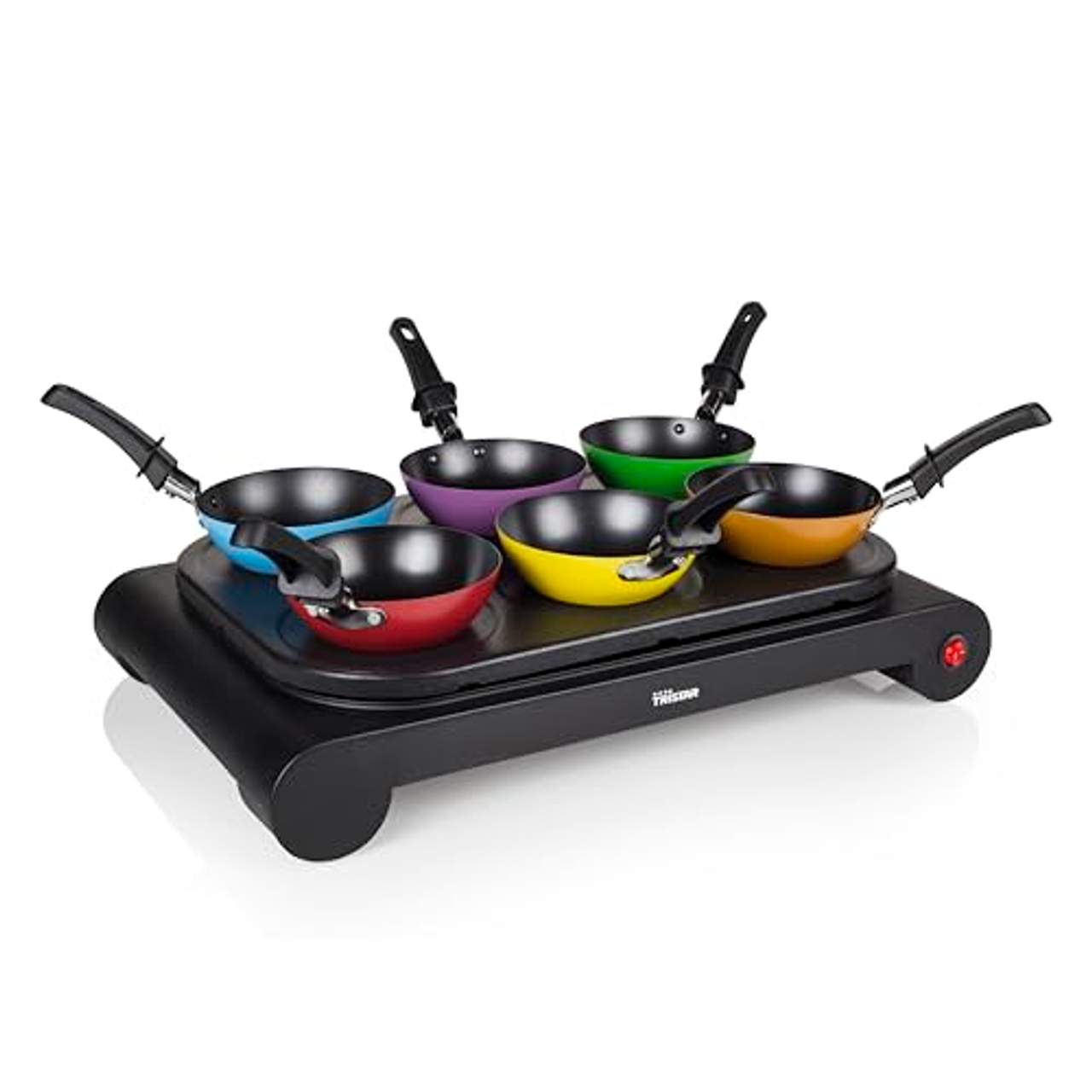 - Spaß und Abwechslung: Mit dem Tristar BP-2827 Party-Wok-Set können sechs Personen gleichzeitig köstliche Wok-Gerichte zubereiten. Jeder kann sein eigenes Gericht in seiner Wokpfanne zubereiten und die Backplatte nutzen, um Crêpes oder Pfannkuchen in den mitgelieferten Formen herzustellen. So lässt sich ein lustiger und abwechslungsreicher Abend mit Freunden und Familie verbringen.