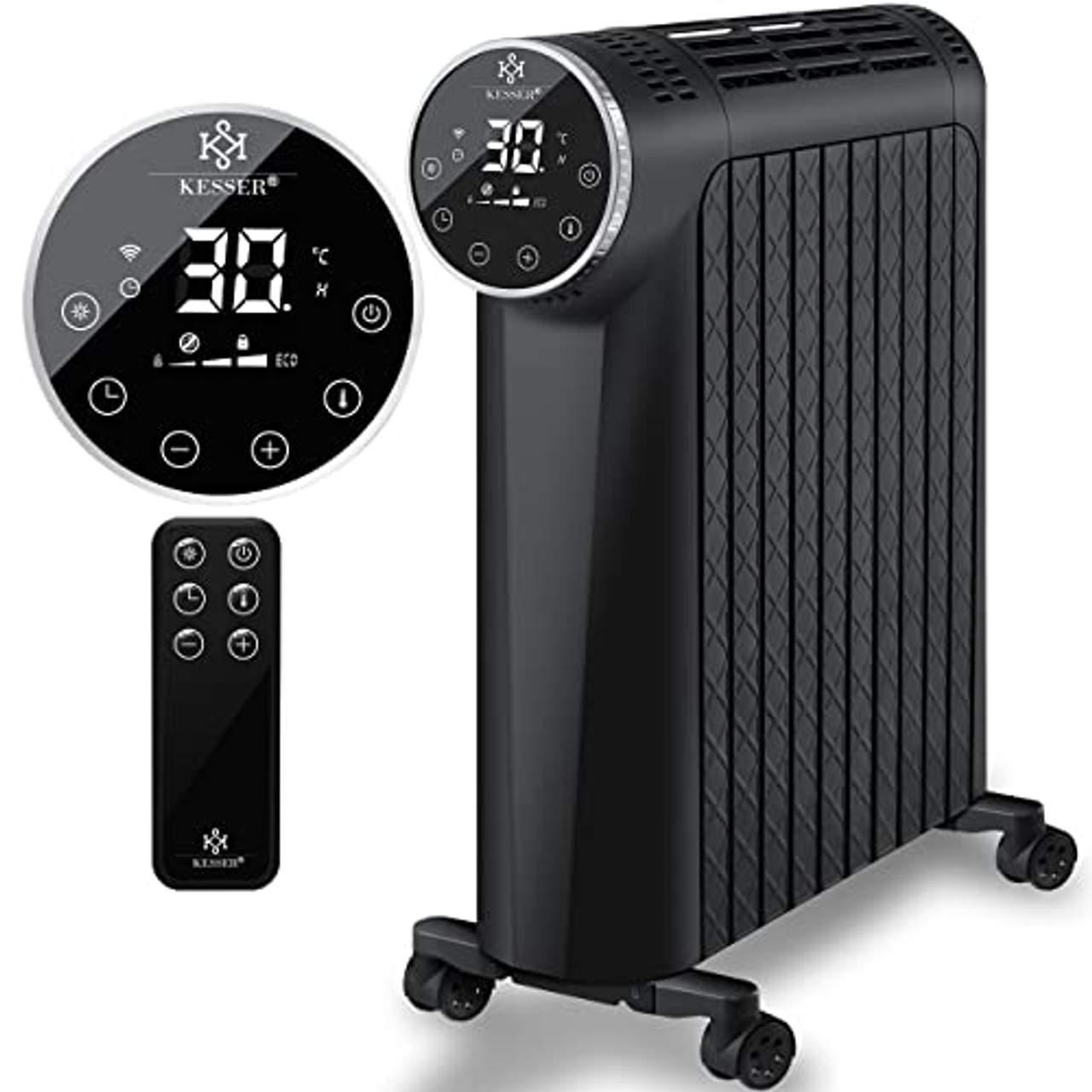 KESSER 2500W Elektrische Heizung Heizkörper ElektroheizungUnser ölgefüllter Heizkörper aus dem Hause KESSER ist die optimale Lösung für lange Herbst- und Winterabende. Der Ölradiator eignet sich perfekt für Räume, die aufgrund von schwachen Heizkörpern oder undichten Fenstern eine leistungsstarke Wärmequelle benötigen. Ebenso kann der Ölradiator ideal für einen kurzen Urlaub im Ferienhaus genutzt werden.Dank der integrierten Rollen ist die mobile Heizung flexibel und eignet sich wunderbar für die Beheizung aller Räume, der Hobby-Garage, Werkstatt, dem Gartenhaus, Keller u.v.m. - Zudem ist er eine clevere Alternative zu herkömmlichen Heizkörpern mit manueller Bedienbarkeit.Die Standheizung ist mit 10 leistungsstarken Rippen ausgestattet, die für eine maximale Leistung von 2500W sorgen. Dies ermöglicht ein schnelles aufheizen des Öls, sodass sich die Rippen schnell auf Temperatur kommen und Räume von bis zu 25m2 mit Wärme füllen können.Wärme schon nach 6 Minuten! - Der KESSER Ölradiator wärmt schon nach 6 Minuten spürbar auf. Zum Vergleich: Herkömmliche Ölradiatoren benötigen ca. 15-20 Minuten. - Das dauert uns zu lange! Die Heizgeschwindigkeit wird neben den Rippen auch durch spezielle Lufttunnel zwischen den Lamellen beeinflusst. Zusätzlich wird die wärme gleichmäßig im gesamten Raum verteilt.Produkt-Highlights:• Leistungsstark• Intelligente Funktionen• Digitales LED-Display mit Bedienmöglichkeit• Inkl. Fernbedienung• Smarte-Home-App• Umkippschutz• Hochwertige Verarbeitung• Kindersicherung• Überhitzungsschutz• Mobil auf 4 Rädern• Abgerundete Form für zusätzliche Sicherheit• Inkl. Thermostat• Timerfunktion• Aufheizen in nur 6 Minuten• Eco-ModusTechnische Details:• Maße: 67,5cm x 52,3cm x 27,5cm (HxLxB)• Leistung: 2500W • Gewicht: 15,8 kg• Displayart: LED-Display• Aufheizdauer: 6 Minuten• Smart-Home - App kompatibel • Geeignet für Räume bis zu 25m2 Lieferumfang:• 1x Ölradiator • 1x Fernbedienung• 1x Betriebsanleitung