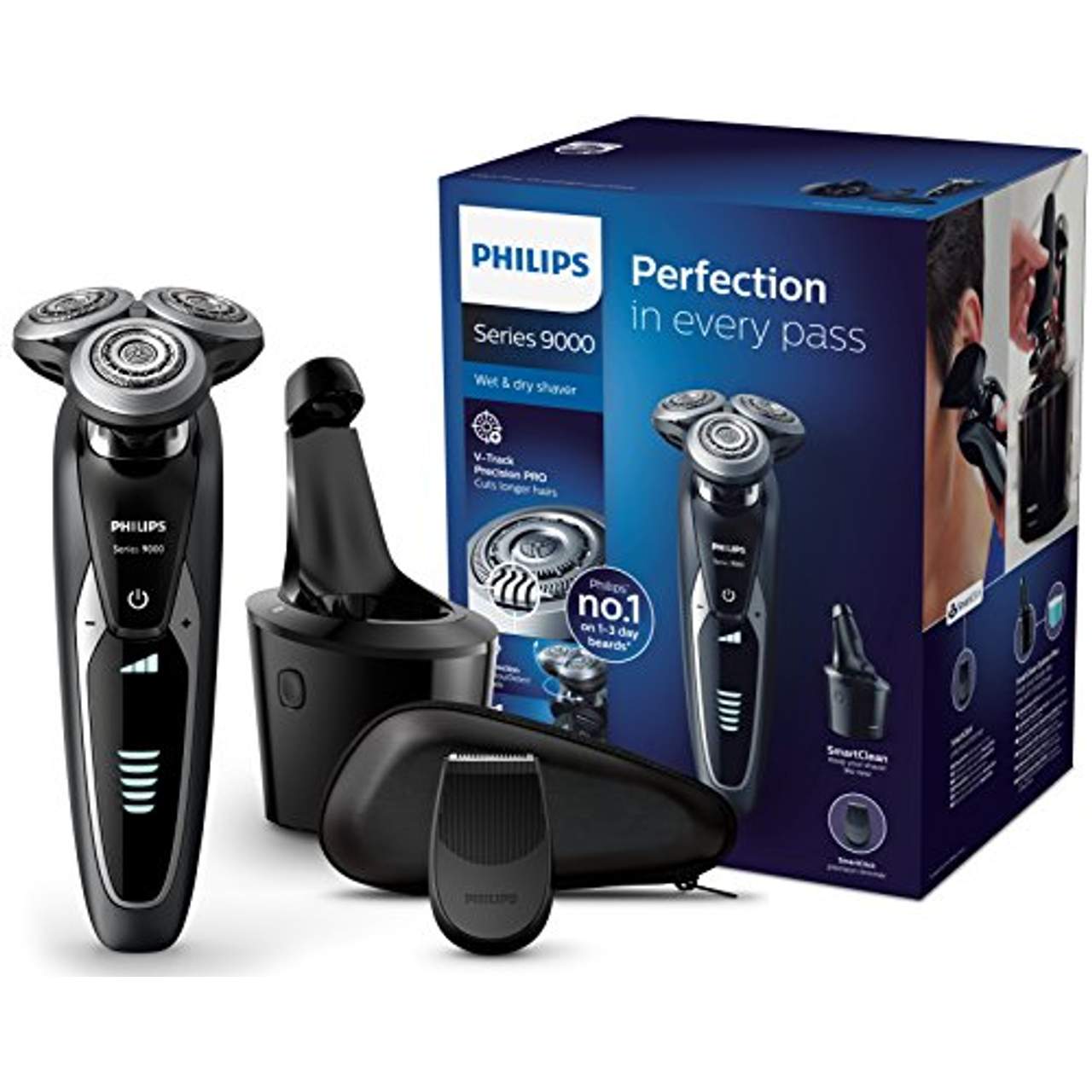 - Komfort und Präzision: Der elektrische Nass- und Trockenrasierer der Serie 9000 von Philips sorgt mit seinen V-Track Pro-Klingen für eine komfortable und präzise Rasur. Diese sorgen dafür, dass jedes Haar gleichmäßig und gründlich geschnitten wird, sodass Sie eine glatte Rasur erhalten.