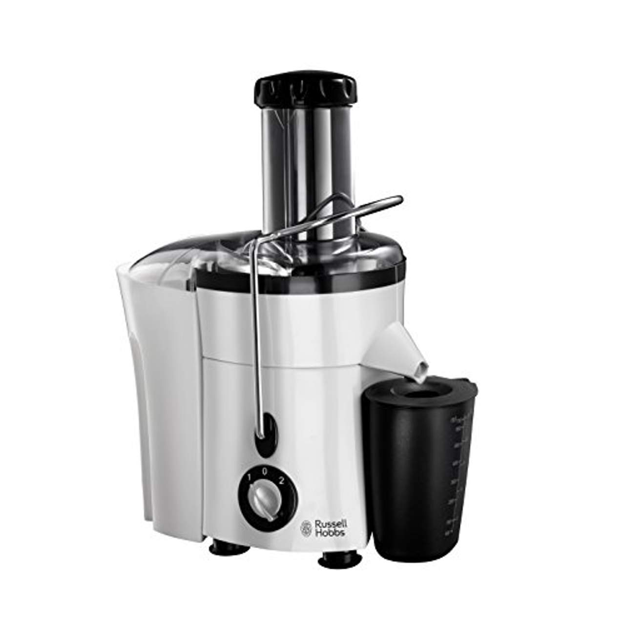 Russel Hobbs Aura Design Entsafter, Weißer Hochglanz-Kunststoff mit schwarzen Applikationen 2 Geschwindigkeitsstufen für harte und weiche Früchte sowie Gemüse Extra große 75 mm Einfüllöffnung für ganze Früchte und Gemüse Extra großer Fruchtfleischbehälter, 2,0 Liter Separater Saftbehälter, 0,7 Liter Einfache Reinigung, alle abnehmbaren Teile sind spülmaschinengeeignet Sicherheitsverriegelung - Inbetriebnahme nur nach korrektem Verschluss möglich BPA-frei - alle Teile, die mit Lebensmitteln in Berührung kommen, sind BPA-frei Leistung: 650 Watt Farbe: Weiß / Schwarz