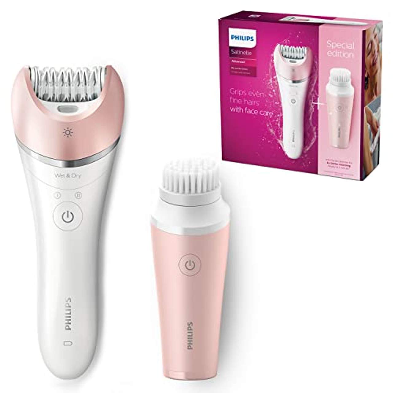 Philips Epiliergerät Satinelle Advanced BRP545/00Unser bisher schnellster Epilierer verfügt über einzigartige Keramikpinzetten, die sich schneller drehen als je zuvor, und so selbst feine und kurze Härchen zuverlässig erfassen. Sie können Ihre Haut jetzt vor oder nach dem Epilieren glätten und Ihren Körper und Ihre Füße verwöhnen.Epilierkopf aus speziellem Keramikmaterial für bessere GriffigkeitUnser Epilierkopf bietet eine einzigartige strukturierte Keramikoberfläche, die selbst feinste Härchen und Haare, die 4 Mal kürzer sind als mit Wachs, sanft entfernt. Jetzt mit schnellerer Scheibenrotation als je zuvor (2.200 U/Min.) für unsere schnellste Haarentfernung.Extrabreiter EpilierkopfDer besonders breite Epilierkopf erfasst mehr Haut und sorgt so mit jedem Zug für schnellere Haarentfernung.Erster Epilierer mit S-förmigem GriffDer ergonomische S-förmige Griff ermöglicht eine einfache Anwendung für eine optimale Handhabung und eine gründlichere Enthaarung am ganzen Körper mit natürlichen und präzisen Bewegungen.Kabellose Nass- und Trockenfunktion für die Verwendung in der Badewanne oder DuscheMit Anti-Rutsch-Griff entwickelt, sodass sich das Gerät ideal für die Verwendung mit Wasser eignet.Ermöglicht eine angenehme, sanfte Haarentfernung unter der Dusche oder in der Badewanne. Sie können das Gerät für optimalen Komfort kabellos verwenden.Opti-Light zum Erkennen und Entfernen von Haaren selbst an den schwierigsten StellenOpti-Light zum Erkennen und Entfernen von Haaren selbst an den schwierigsten Stellen6 x effektivere Reinigung*, einsatzbereit in 1 Minute.Dieses Special Edition-Paket bietet eine Mini-Gesichtsreinigungsbürste mit Drehtechnologie. Sie ist kompakt und einfach zu verwenden und die perfekte Ergänzung zu Ihrer täglichen Hautpflege, egal wo Sie sind. Insgesamt 17.000 seidig weiche Borsten fegen Verunreinigungen weg und sorgen so für eine gründlich gereinigte und strahlende Haut.Das Gerät ist effektiv bei Verunreinigungen und dabei so sanft, dass Sie es zweimal täglich verwenden können. Mit allen Philips VisaPure-Bürsten kompatibel, die speziell auf Ihren Hauttyp und Ihre Anforderungen abgestimmt sind.- Für Beine, Körper und Gesicht- Keramikpinzetten erfassen feine Haare- 2 Pflegeroutinen für Körper und Gesicht- + Gesichtsreinigung
