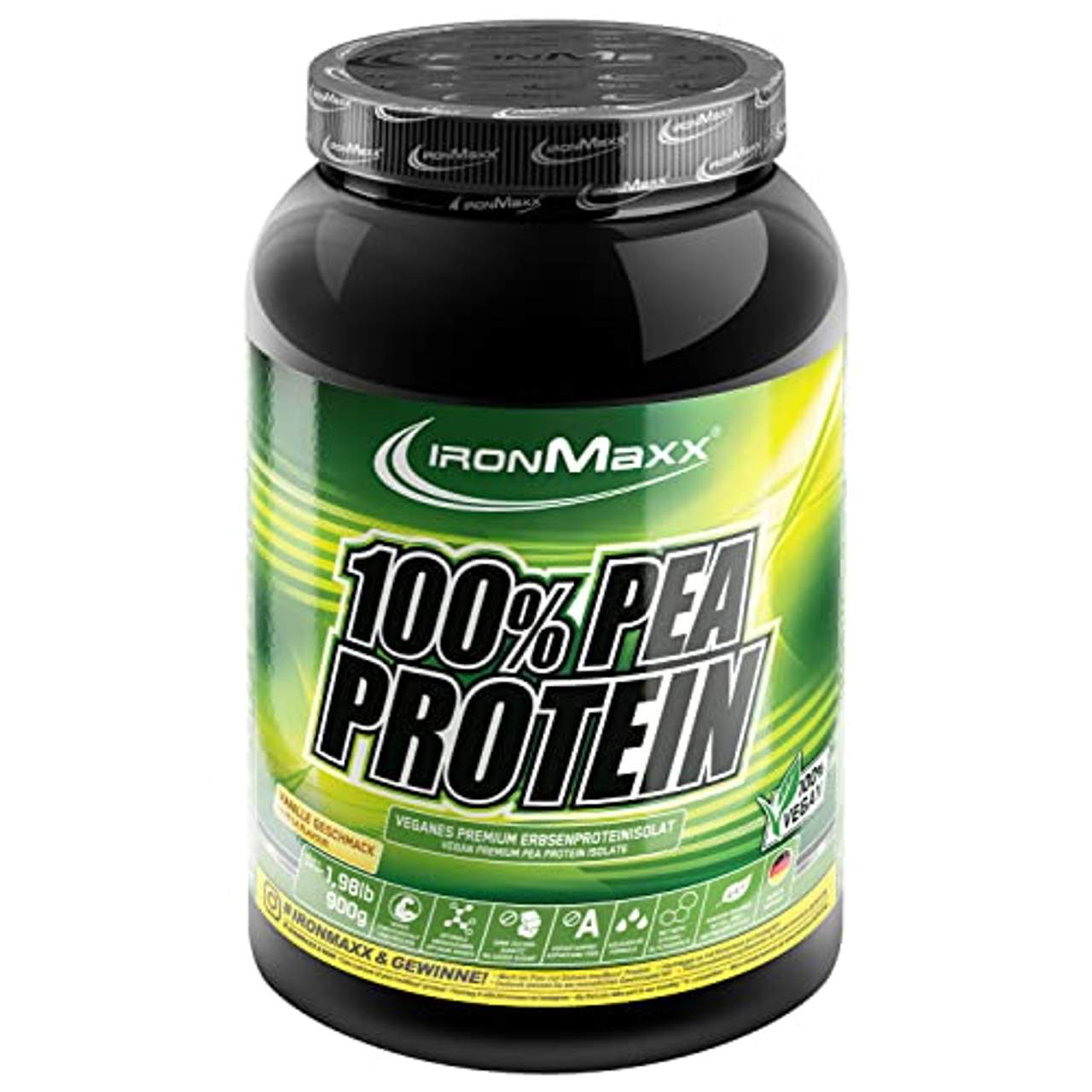 IronMaxx 100% Erbsenprotein ist ein veganes Nahrungsergänzungsmittel für Bodybuilder, Ausdauer- und Leistungssportler. Es hat 79,8 g Protein pro 100 g, enthält verzweigtkettige Aminosäuren und ist kohlenhydratarm. Außerdem ist es hypoallergen und für Menschen geeignet, die eine Allergie gegen Gluten, Laktose, Soja oder Ei haben. Es ist in der Geschmacksrichtung Vanille erhältlich und wird in Packungen mit 1 x 900 g Pulver geliefert.