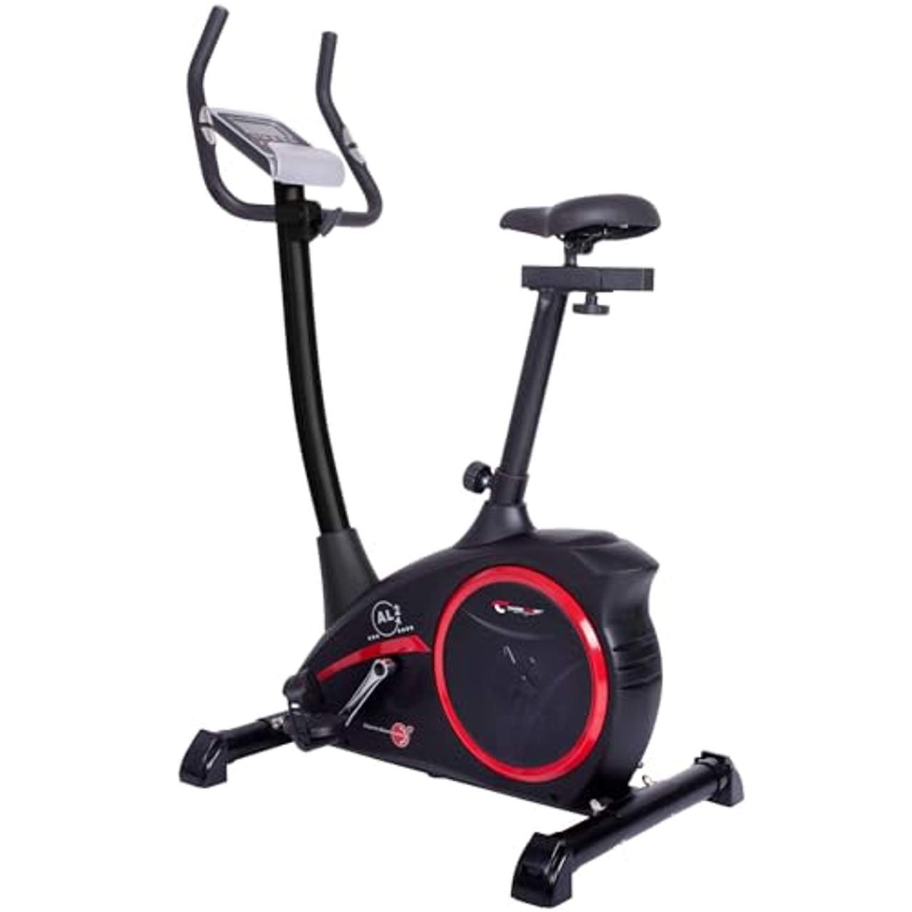Christopeit Sport Fahrrad-Heimtrainer AL 2 Black EditionDer stabile Ergometer ist mit einem verschleißfreien und ca. 9 kg Magnet-Brems-System ausgestattet. Der flüsterleise Flachriemenantrieb ermöglicht ein geräuscharmes Training mit gutem Rundlaufverhalten. Der Tretwiderstand ist mittels der Widerstandsregulierung komfortabel in 24 Stufen einstellbar. Der bedienungsfreundliche Computer, inklusive Halter für ein Smartphone oder Tablet, hat ein großes LCD-Display, das in 6 Fenster unterteilt ist und so viele Anzeigewerte auf einen Blick anzeigt. Dieser lässt sich durch einfaches Berühren der Tastflächen leicht bedienen. Individuelle Trainingsziele können durch Auswahl der verschiedenen Programme realisiert werden. Ein abwechslungsreiches Training mittels der fest hinterlegten 10 Trainingsprogramme ist genauso einfach realisierbar wie ein pulsüberwachtes Herzfrequenztraining mit den unterschiedlich belastenden Herzprogrammen.Die 5 individuellen Trainingsprogramme ermöglichen es, sich eigene Trainingsprogramme zu erstellen. Die Fitness Test Funktion beurteilt nach dem Training die Trainingsleistung nach dem Schulnotenprinzip. Die Handpulssensoren sind im Lenker integriert und können zur Pulsüberwachung beim Training genutzt werden.Der Sattel ist mittels eines Schnellverschlusses vertikal in der Höhe und zusätzlich horizontal verstellbar, so dass eine angenehme individuelle Trainingsposition ausgewählt werden kann. Die rutschhemmenden Pedale mit dem separaten Pedalsicherungsband sorgen für eine stabile Fußposition beim Treten.Die vorderen Transportrollen ermöglichen einen einfachen Standortwechsel und mittels der hinteren höhenverstellbaren Fußkappen ist ein sicherer Stand des Gerätes gewährleistet. Ergometer Training mit dem AL 2 bedeutet: wetterunabhängiges, Radfahr-Training mit Leistungskontrolle zur körperlichen Ertüchtigung, sowie auch zielorientiertes Herzkreislauf-Training oder Ausdauertraining mit Pulsüberwachung. Dies kann eine Förderung des Stoffwechsels, eine Kräftigung der Beinmuskulatur und so eine Verbesserung des allgemeinen Fitness-Zustandes zur Folge haben.