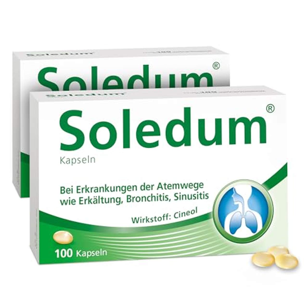Soledum Kapseln Sparset mit 2 x 100 KapselnDas Set enthält: 2x PZN 6349838 Soledum Kapseln 100 Stück Soledum Kapseln ? Bekämpft die Entzündung. ? Löst festsitzenden Schleim. ? Gut verträglich. ? Bei Erkrankungen der Atemwege wie Erkältung, Bronchitis, Sinusitis Soledum Kapseln sind ein entzündungshemmendes und schleimlösendes Arzneimittel zur Behandlung der Symptome von Atemwegserkrankungen wie Erkältung, Bronchitis, Sinusitis. Beeinträchtigte Nasenatmung bei verstopfter oder ?laufender? Nase, Druckgefühl im Kopf bei Nasennebenhöhlenentzündung oder Husten:Soledum Kapseln wirken entzündungshemmend und schleimlösend auf Basis des reinen, pflanzenbasierten Wirkstoffs Cineol und haben eine von Grund auf befreiende Wirkung in den oberen und unteren Atemwegen. Als natürlicher Wirkstoff mit klinisch nachgewiesener Wirksamkeit ist Cineol als starker Entzündungshemmer und Schleimlöser anerkannt - so wird das Abhusten erleichtert und der Sekretstau verhindert. Sinnvoll ist hierbei der Kontakt von Cineol mit dem Wirkort: der durch die Infektion und Entzündung angegriffenen Schleimhaut der Atemwege. Dieser Kontakt erfolgt, indem das Cineol nach der Einnahme der Soledum Kapseln auf natürlichem Weg über die Blutbahn auch zur Lunge transportiert wird und dort abgeatmet wird.Soledum Kapseln sind für Erwachsene und Kinder ab 2 Jahren geeignet. Der Beipackzettel der jeweiligen Einzelprodukte befindet sich unter der entsprechenden PZN in unserem Shop.