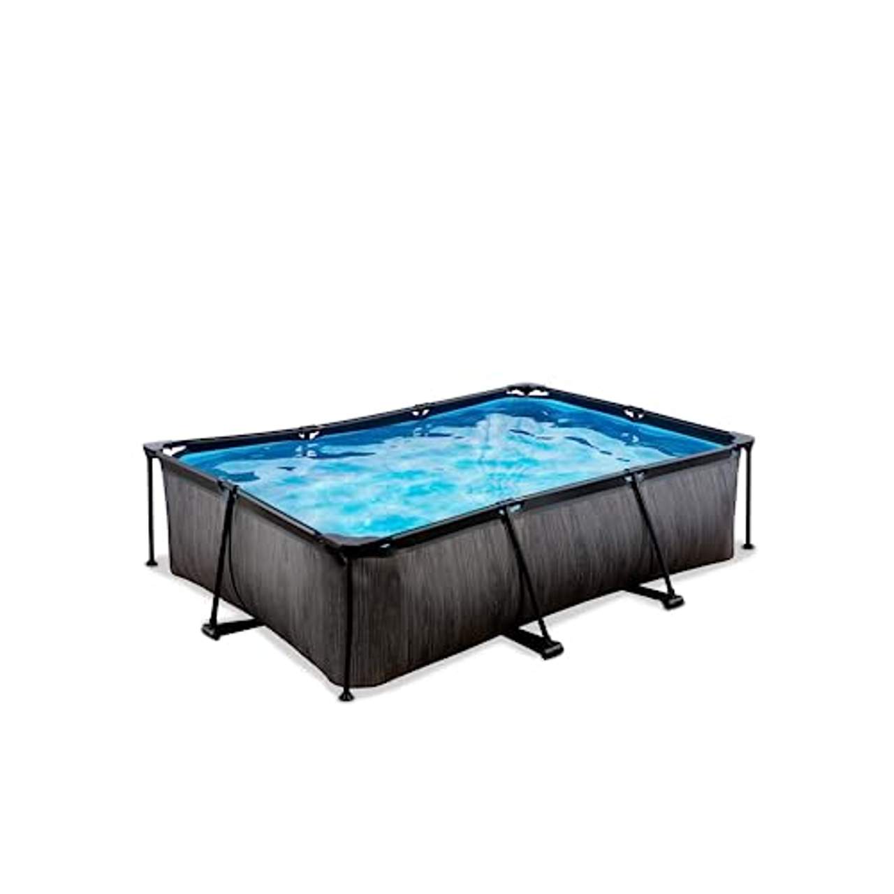 EXIT Black Wood Pool 220 x 150 x 65 cmDer EXIT Black Wood Pool 220 x 150 x 65 cm ist ein rechteckiger Rahmenpool mit Abdeckung. Der Pool ist standartmäßig mit einer Filterpumpe ausgestattet und fällt durch sein cooles, dunkles Holzmuster zwischen anderen Pools auf. Entdecke wie stabil ein rechteckiger Aufbaupool sein kann:der pulverbeschichtete stählerne Rahmen und die starken Eckpunkte des EXIT Black Wood Pools sorgen dafür, dass der Pool immer stabil steht und jahrelang genutzt werden kann. Die mitgelieferte Filterpumpe hält das Wasser sauber und in Bewegung, so dass einer Verschmutzung des Wassers entgegengewirkt wird.Mit der EXIT Abdeckung für Pools bist du nicht länger von Wettervorhersagen abhängig. Die Abdeckung sorgt dafür, dass kein Schmutz in das Wasser gelangen kann und ist gleichzeitig eine nachhaltige Lösung zum erwärmen deines Wassers, denn die Wärme der Sonne wird unter der Abdeckung festgehalten.Die Abdeckung ist sehr einfach durch den einzigartigen Scharniermechanismus zu öffnen und dank der