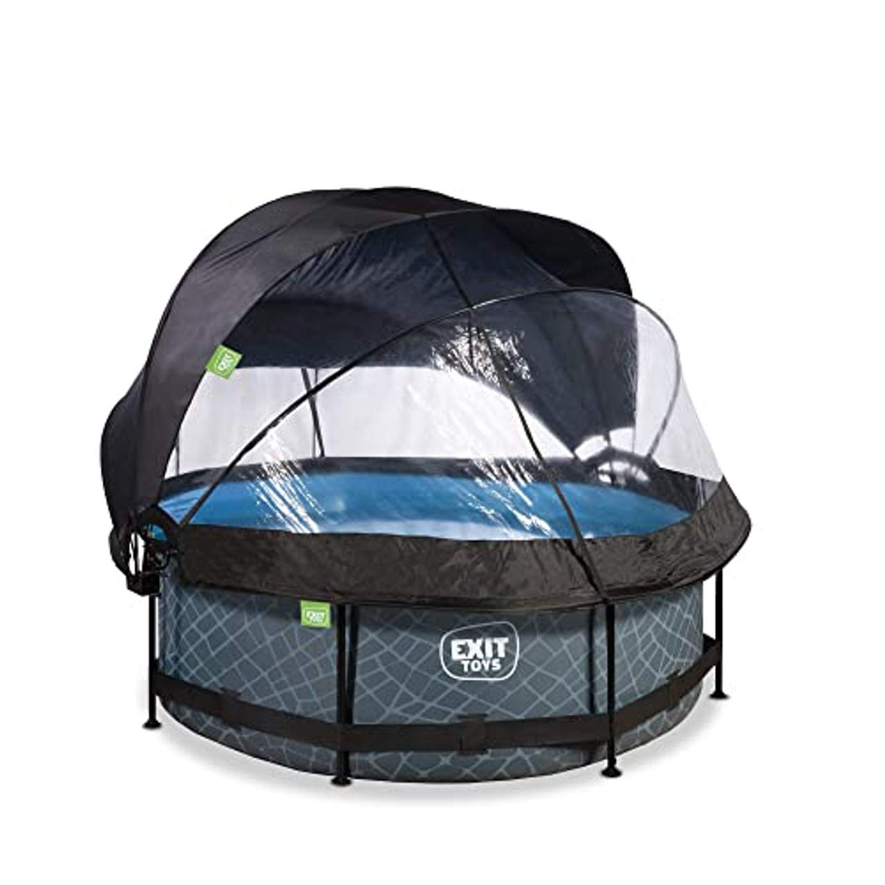 EXIT Stone Pool ø244x76cmDer EXIT Stone Pool ø244x76cm ist ein runder grauer Rahmenpool mit Abdeckung und Sonnensegel. Der kompakte Pool ist standartmäßig mit einer Filterpumpe ausgestattet und fällt durch sein tolles Steinmuster zwischen anderen Pools auf. Entdecke wie stabil ein runder Aufbaupool sein kann:der pulverbeschichtete stählerne Rahmen und die starken Füße des EXIT Stone Pools sorgen dafür, dass der Pool immer stabil steht und jahrelang genutzt werden kann. Die mitgelieferte Filterpumpe hält das Wasser sauber und in Bewegung, so dass einer Verschmutzung des Wassers entgegengewirkt wird.Mit der EXIT Abdeckung für Pools bist du nicht länger von Wettervorhersagen abhängig. Die Abdeckung sorgt dafür, dass kein Schmutz in das Wasser gelangen kann und ist gleichzeitig eine nachhaltige Lösung zum erwärmen deines Wassers, denn die Wärme der Sonne wird unter der Abdeckung festgehalten.Und dank dem einzigartigen Sonnensegel von EXIT Toys kannst du auch bei strahlendem Sonnenschein unbeschwert schwimmen. Das Sonnensegel verfügt über ein benutzerfreundliches Fächersystem, mit dem du im Handumdrehen Teil- oder Vollschatten erzeugen kannst. Mit den verstellbaren Gurten kannst du das Segel je nach Sonnenstand verschieben und in jeder gewünschten Höhe fixieren.Das tolle Steinmuster und der schwarze Rahmen geben dem Stone Pool eine einzigartige Ausstrahlung und dank des natürlichen Aussehens integriert sich der Pool völlig in deinen Garten. Die Innenseite des Pools ist blau, so dass du das frische Schwimmbad-Gefühl hast.PVC, Stahl 185 / ø 274 cm