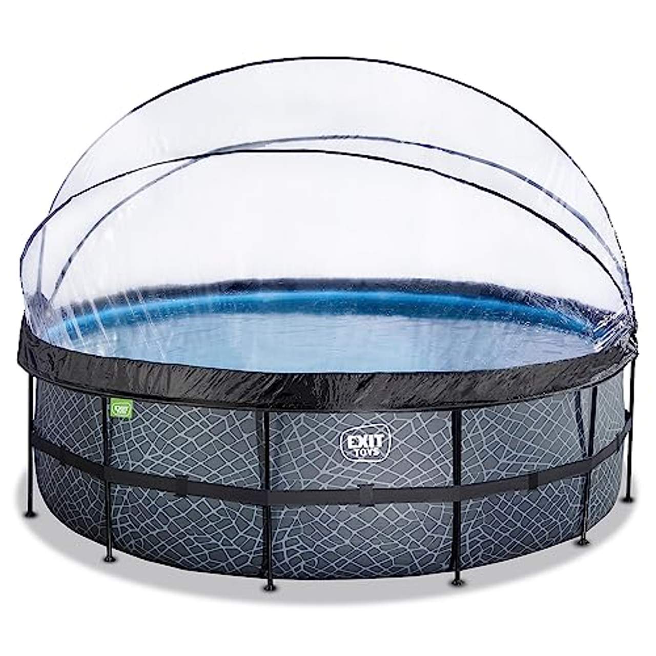 EXIT Stone Pool ø450x122cmDieser EXIT Pool ist ein runder Rahmenpool mit Abdeckung. Der Pool ist standardmäßig mit einer Sandfilterpumpe und einer Poolleiter ausgestattet, mit der Sie sicher in den und aus dem Pool steigen können. Der Pool ist hübsch und praktisch gestaltet.Er mit starken 3-lagigen Wänden aus PVC und Polyester versehen. Das mitgelieferte Wasserkreislaufsystem rundet den Pool ab. Die hochwertige Sandfilterpumpe reinigt wie in der Natur, indem das Wasser kräftig durch Sand gepumpt wird. Dies sorgt dafür, dass Schmutz, wie Sand, Ungeziefer oder Algen im Filter zurückbleiben.Mit der EXIT Abdeckung für Pools sind Sie nicht länger abhängig von den Wettervorhersagen. Die Abdeckung sorgt dafür, dass kein Schmutz mehr in das Wasser kommen kann und ist gleichzeitig eine nachhaltige Lösung zum Erwärmen des Wassers:Sonnenwärme wird unter der Haube festgehalten. Die Abdeckung ist durchsichtig und sehr einfach durch integrierte Gasdruckfedern zu öffnen. Sie besitzt vier auffaltbare Fenster. Sogar bei kühlerem Wetter bietet der Pool dank der enthaltenen Wärmepumpe die Möglichkeit, darin Bäder zu nehmen.Das Wasser lässt sich damit auf bis zu 40°C aufheizen. Der stählerne Rahmen des Pools ist extra stark mit einem Durchmesser der Streben von 50 Millimeter. Die Beine sorgen für optimale Stabilität, sodass der Pool bei sachgerechter Benutzung fest steht.Natürlich ist auch an die Langlebigkeit gedacht: Der schwarze Rahmen ist galvanisiert und pulverbeschichtet damit Rost keine Chance hat. Details: - Anzahl der Beine: 12 Stück - maximale Anzahl Personen: 8 (wenn sich 8 Personen im Pool aufhalten, darf keine Person über 120 wiegen) - Leiter mit Anti-Rutsch-Stufen - Spannung Sandfilterpumpe: 12V - Pumpenleistung Sandfilterpumpe: 3028 Liter/Stunde - Spannung Wärmepumpe : 230V - Filterleistung Wärmepumpe : 1300 Liter/Stunde Lieferumfang: - 1 x Pool (Poolrahmen, Liner) - 1 x Poolabdeckung mit 4 Fenstern - 1 x Wärmepumpe - 1 x Leiter - 1 x Filterpumpe mit Kartusche - 1 x Liner Reparatur-Set - 1 x Aufbau-/Bedienungsanleitung Maße: Pool: - Wasserkapazität (80% Füllmenge): 15.233 Liter - Maße außen: ca. 450 x 122 cm (Ø x H) - Maße innen: ca. 430 x 110 cm (Ø x H) - Gewicht: ca. 125 kg Leiter: - Maße: ca. 84 x 172 x 120 cm (B x H x T) - Anzahl der Stufen: 6 Stufen - max. Tragkraft: 120 kg Material: Stahl, PVC