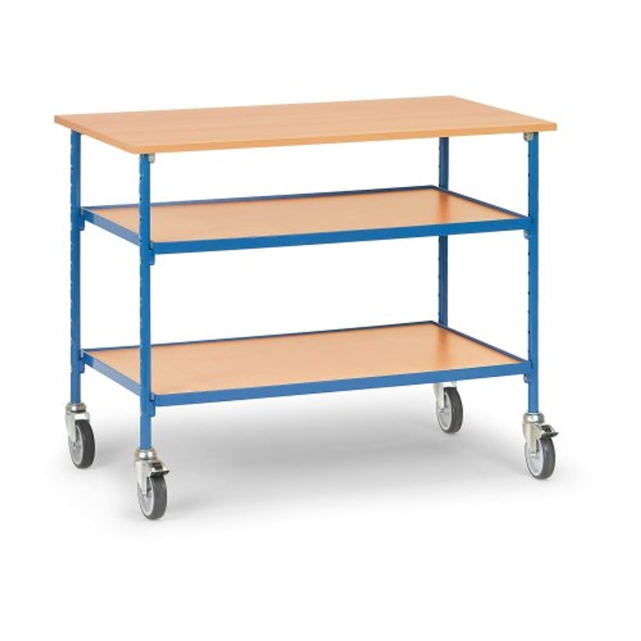 Fetra Transportgeräte bboa862 Handy WerkbankStahlrohr und Profilstahl geschweißt, Schraubkonstruktion pulverbeschichtet, blau RAL 5007 Tischfläche Sandwich-Platte 19 mm stark, Oberfläche Buchendekor 2 Ablageböden im Raster von 50 mm variabel einschraubbar, 1 x Ordnerhöhe möglich 4 Lenkrollen, TPE-Bereifung Naben mit Gleitlager 2 Stück mit Feststeller, gemäß der Europäischen Norm EN 1757-3 (Sicherheit von Plattformwagen) Tragkraft pro Boden 50 kg. Artikel-Nr. 5862 Tragkraft (kg) 150 Tischfläche LxB (mm) 1120x650x910 Rad-Ø (mm) 125 Eigengewicht (kg) 42