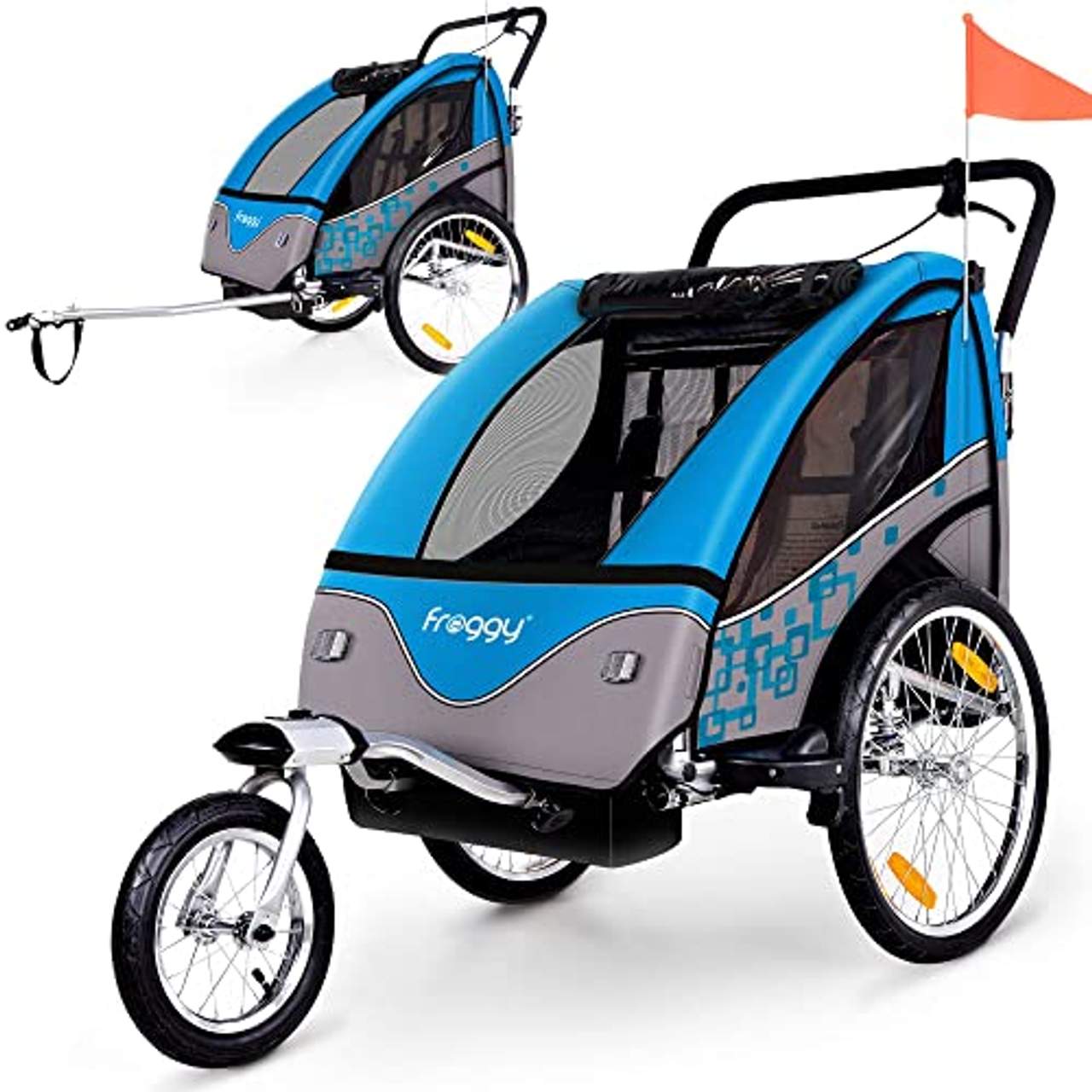 Froggy Kinder Fahrradanhänger 360° DrehbarDer komfortable 2 in 1 Kinderfahrradanhänger ist als Anhänger oder Jogger verwendbar und bietet optimalen Komfort für bis zu 2 Kinder. Der stabile Stahlrohrramen, Überrollbügel, 5 in 1 Sicherheitsgurte, Reflektoren und Wimpel sorgen für hohe Sicherheit während der Fahrt. Dank gefederter Hinterachse wird der Rücken der Kinder geschont und der um 360 Grad drehbares Vorderrad macht den Jogger sehr wendig. Durch das luftdurchlässige Fliegennetz im Frontbereich gestalltet sich die Reise angenehmer und das faltbare verdunkelte Sichtfenster schützt vor Regen, Sonne und Wind.
