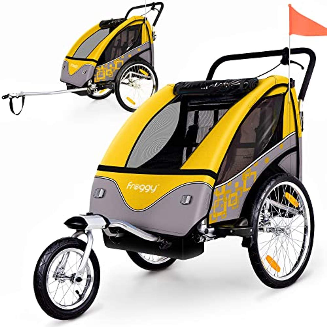 Froggy Kinder Fahrradanhänger 360° DrehbarDer komfortable 2 in 1 Kinderfahrradanhänger ist als Anhänger oder Jogger verwendbar und bietet optimalen Komfort für bis zu 2 Kinder. Der stabile Stahlrohrramen, Überrollbügel, 5 in 1 Sicherheitsgurte, Reflektoren und Wimpel sorgen für hohe Sicherheit während der Fahrt. Dank gefederter Hinterachse wird der Rücken der Kinder geschont und der um 360 Grad drehbares Vorderrad macht den Jogger sehr wendig. Durch das luftdurchlässige Fliegennetz im Frontbereich gestalltet sich die Reise angenehmer und das faltbare verdunkelte Sichtfenster schützt vor Regen, Sonne und Wind.