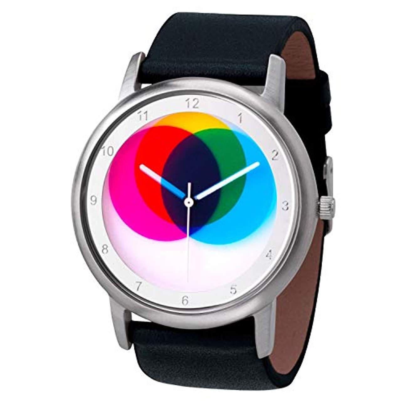 Das CMYK Design des Zifferblattes zeigt das Prinzip der subtraktiven Farbmischung mit Ablesemöglichkeit der Uhrzeit.