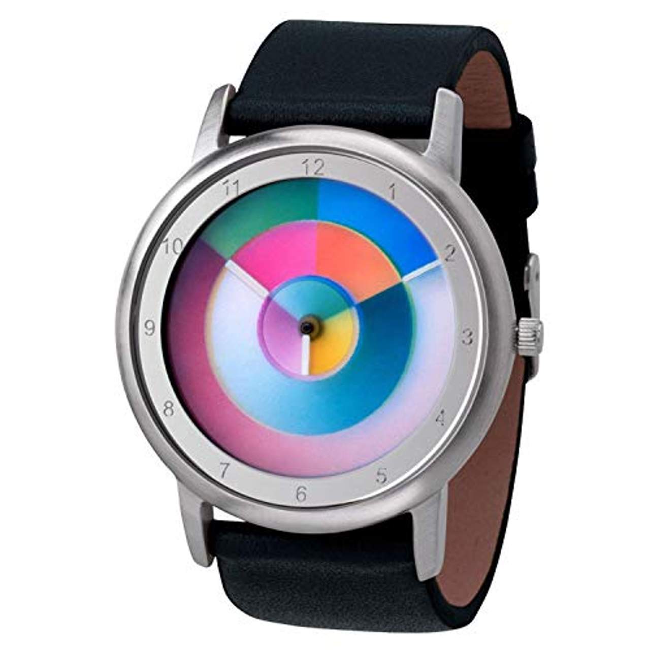 - Einzigartiges Design: Das Produkt verfügt über ein einzigartiges Design des Künstlers Paul Heimbach, bei dem die Farbsegmente aller drei Kreise kontinuierlich ihre Größe und Farbe ändern, um ein lebendiges, kontrastreiches Design zu schaffen. Zusätzlich erzeugt das reflektierende Passepartout mit transparenten Ziffern einen 3D-Effekt mit leichtem Schimmer auf dem Zifferblatt, wenn das Licht schräg darauf fällt, was den visuellen Reiz dieser Uhr noch verstärkt.