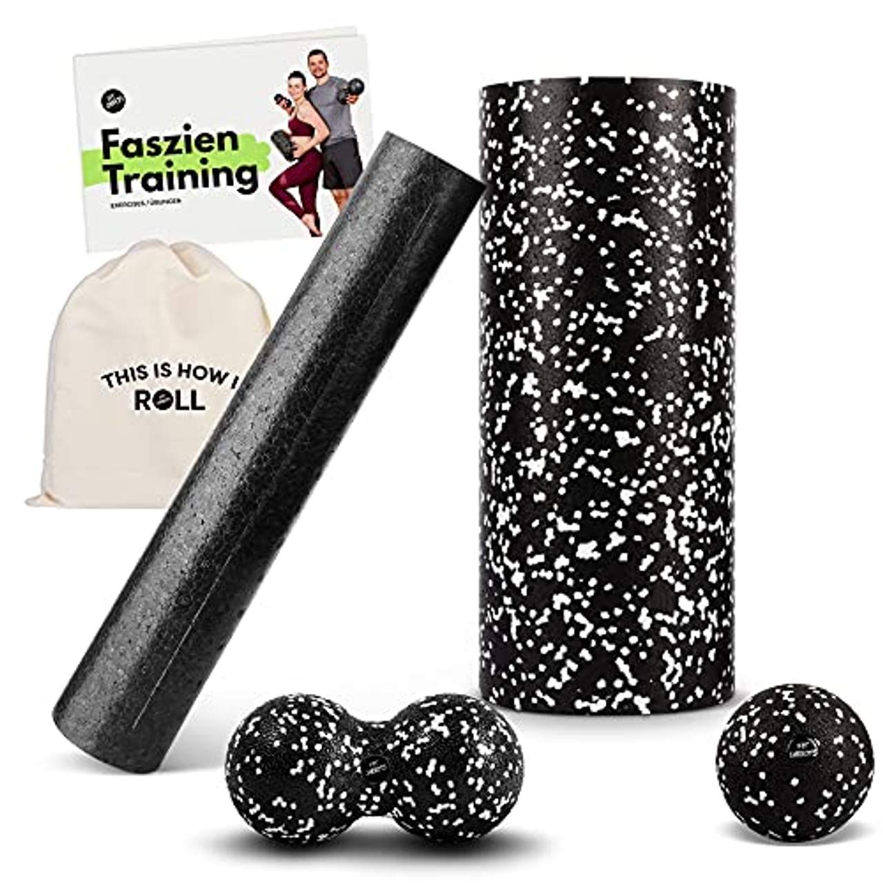 Große Faszienrolle Innenrolle Transporttasche Trainingsanleitung4-Tlg mit Duoball Set: