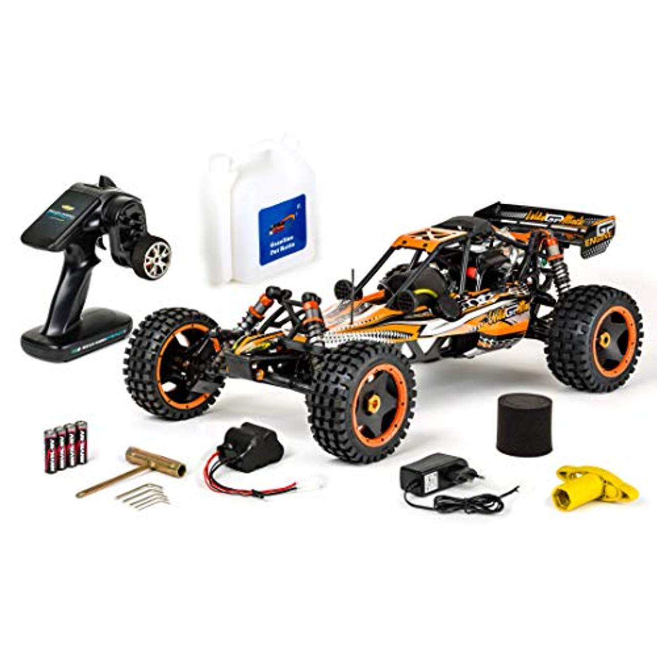 Ja, das Carson 500304032 304032 1:5 Wild GP Attack 2.4G RC Verbrenner Paket enthält alles, was du für ein ultimatives Fahrerlebnis brauchst, außer dem Zweitaktgemisch. Das heißt, es kommt mit einer 2,4-GHz-Reflex-3-Fernsteuerung mit Senderbatterien, einem Werkzeugsatz, einem Ersatzluftfilter, einem Mischkanister und sogar einer ausführlichen mehrsprachigen Anleitung.