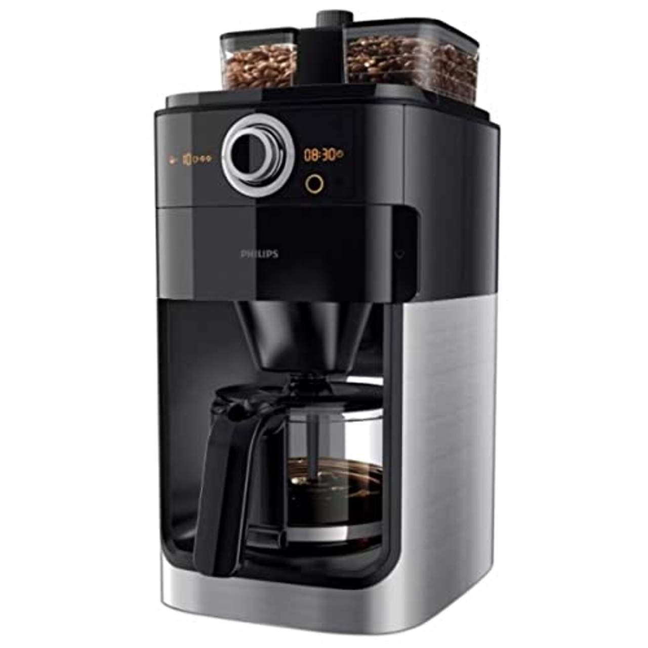 Philips Filterkaffeemaschine mit Mahlwerk Grind and Brew HD7769/00p Mit der HD7769/00 Grind&Brew Kaffeemaschine von PHILIPS treffen Kaffeeliebhaber genau die richtige Wahl! /p p Bereits auf den ersten Blick punktet die Maschine durch ihr Design in Schwarz und Metall. Nach einer vollen Beladung kann das Gerät bis zu 12 Tassen zubereiten. Die Temperatur des Wassers beim Durchlaufen des Kaffeepulvers ist wichtig für die Qualität des fertigen Getränks.Mit einer Leistung von bis zu 1000 Watt kann die Kaffeemaschine perfekt brühen und sorgt somit für ein kräftiges Aroma Ihres Kaffees. Da die Maschine über eine Zeitschaltuhr verfügt, müssen Sie sich nicht mehr früh am Morgen mit der Zubereitung Ihres Lieblingsgetränks beschäftigen.Einfach am Vortag die Ladung vorbereiten, den Timer einstellen und schon können Sie mit einer Tasse frischen Kaffee entspannt in den nächsten Tag starten. /p p Mit ihrem zeitlosen Design passt die mitgelieferte Glaskanne zu jeder Umgebung. Auch die Reinigung des Behälters ist nicht aufwändig, denn er kann einfach in die Spülmaschine gestellt werden. Die Kaffeemaschine verfügt über eine praktische Warmhaltefunktion, wodurch Ihr Kaffee immer heiß bleibt und seinen kräftigen Geschmack nicht verliert.Auf dem LCD-Display werden alle wichtigen Informationen und möglichen Einstellungen angezeigt. Dank der programmierbaren Einschaltzeit bestimmen Sie schon am Abend vorher den Zeitpunkt, wann der Kaffee am Morgen fertig sein soll. /p p Ein unendlich langes Nachheizen ist mit dieser Kaffeemaschine praktisch unmöglich. Die Abschaltautomatik nimmt das Gerät selbstständig vom Netz, vermeidet Stromverschwendung und geht kein Risiko ein. Bei älteren Kaffeemaschinen ist häufig nicht einfach zu sehen, ob diese noch eingeschaltet sind.Eine Betriebskontrollleuchte zeigt Ihnen auf einen Blick, ob das Gerät aktiv ist und stellt somit einen praktischen Sicherheitsmechanismus dar. Dank der Füllstandsanzeige wissen Sie sofort, wie viel Kaffee zubereitet werden kann. Sie können die Kanne auch während dem Brühen aus dem Gerät ziehen.Der Tropfstopp verhindert das Auslaufen der Kaffeemaschine und erlaubt nur dann einen Wasserfluss mit einer korrekt positionierten Kanne. Für eine vereinfachte Reinigung kann der Filterhalter der Maschine entfernt und wiedereingebaut werden. In den Bohnenbehälter können bis zu 250 g Kaffeebohnen gefüllt werden. Bis zu 2 Minuten kann Ihr Kaffee warm gehalten werden. /p p Diese Maschine darf in keiner Küche fehlen: die Kaffeemaschine HD7769/00 Grind&Brew von PHILIPS. /p