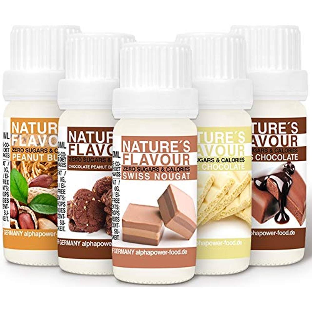 Das ALPHAPOWER FOOD Flavour Drops 5x Spar Set enthält fünf köstliche Geschmacksrichtungen: Schweizer Nougat, Schokolade - Erdnussbutter Cookie, Weiße Schokolade, Schweizer Schokolade und Erdnussbutter. Diese Geschmacksrichtungen verleihen deinen Gerichten und Getränken eine köstliche Note.