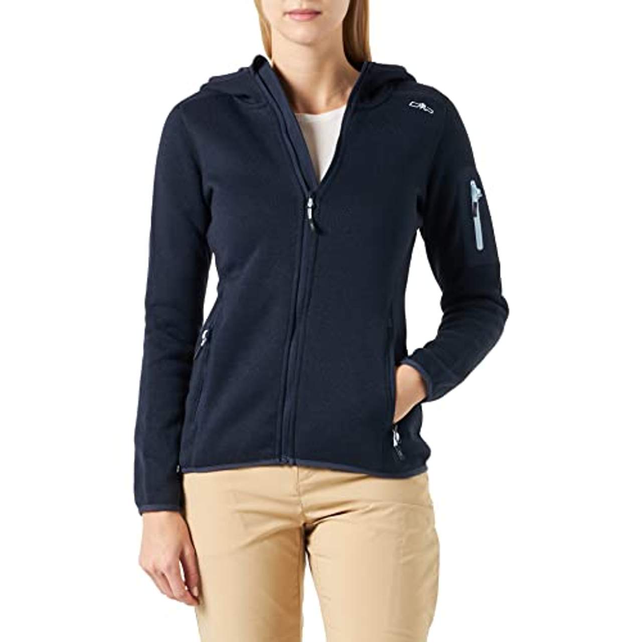 CMP Damen-Knit-Tech-Jacke mit fester KapuzeMit der Strickfleecejacke von CMP geht es für Motivierte richtig ausgestattet zum Sport oder nach draußen. Sie hat einen einreihigen Reißverschluss mit Kinnschutz sowie eine Kapuze mit Gummizug und farblich passendem Innenfutter. Sowohl an den langen Ärmeln als auch am Rumpfabschluss ist ein elastischer Bund.In den Reißverschlusstaschen finden Wertsachen Platz, die auch unterwegs dabei sein sollen. Der Look wird mit einem Logoschriftzug abgerundet. Die Strickfleecejacke ist atmungsaktiv, schnell trocknend und wärmend. So sorgt sie für ein angenehmes Tragegefühl, wenn es während der Sport-Session im Freien leicht anfängt zu regnen.Sie passt gut zu einem atmungsaktiven Oberteil. So kann schnell auf unerwartete Wetterumschwünge reagiert werden und die Sporteinheit kann auch bei plötzlichem Regen weitergehen.