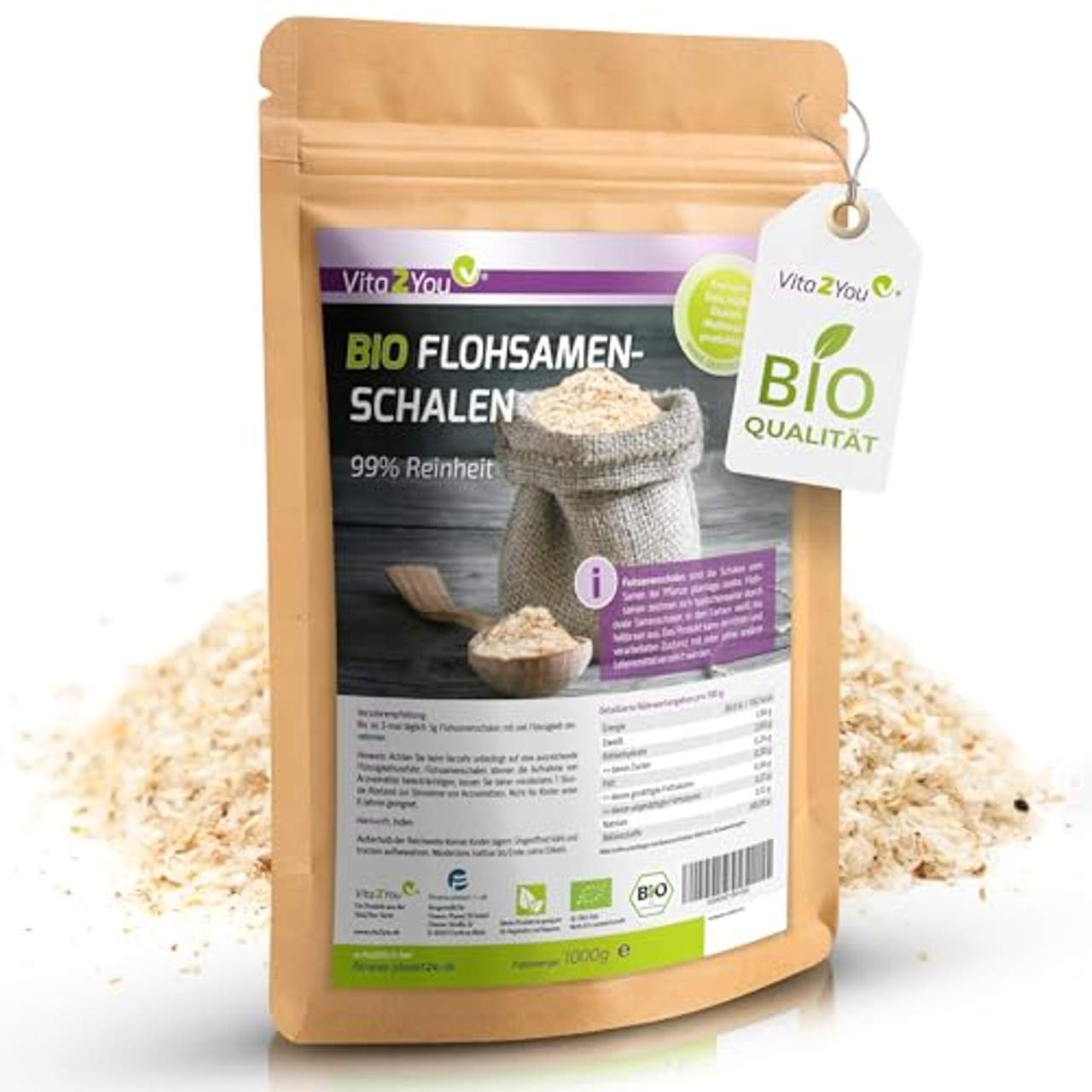 Dieses Produkt namens „BIO Flohsamenschalen 99% Reinheit 1000g“ wird von Vita2You hergestellt. Es ist bio-zertifiziert durch DE-ÖKO-001 und hat eine hohe Reinheit von 99%. Diese Flohsamenschalen bieten ein sehr gutes Preis-Leistungs-Verhältnis, sind frei von Allergenen, für Vegetarier und Veganer geeignet und in Deutschland auf Schadstoffe geprüft. Er ist auch als Kapseln unter der gleichen Marke erhältlich (Amazon-Suche: B07cjqcybf).