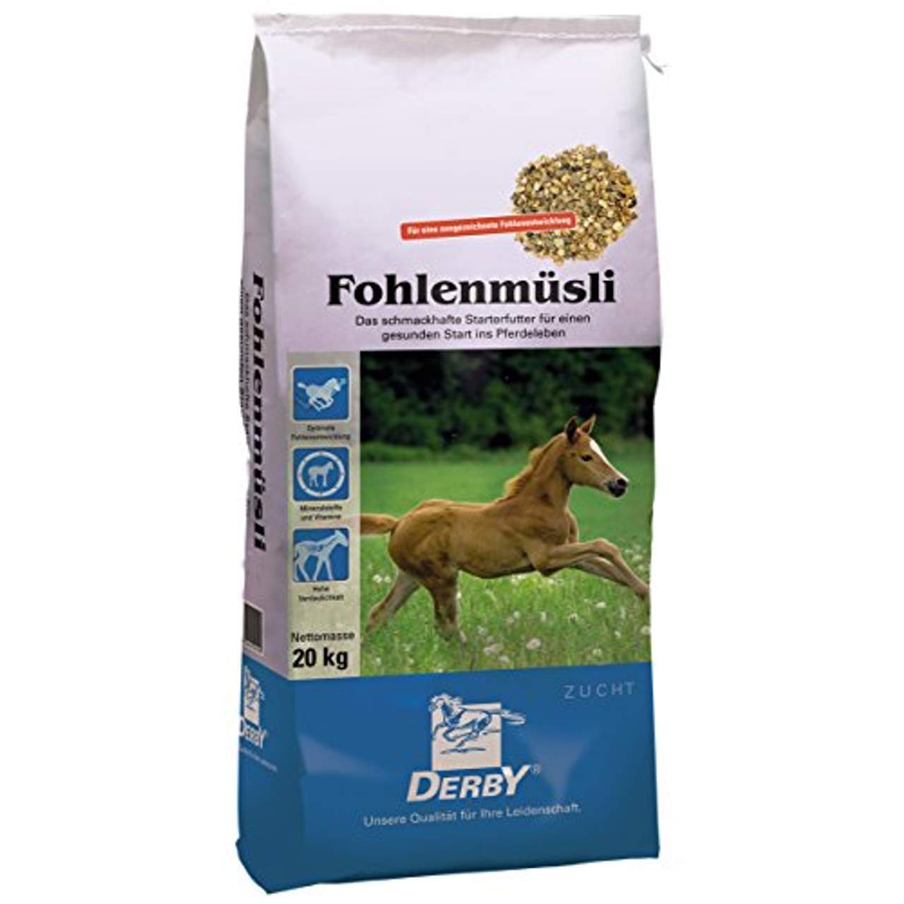 - Für Fohlen, Absetzer und Jährlinge: Derby Fohlenmüsli 20 kg kann sowohl für Fohlen als auch für Absetzer und Jährlinge verwendet werden. Damit ist es die ideale Wahl für Pferdebesitzer, die ihre Tiere ein Leben lang optimal ernähren wollen.