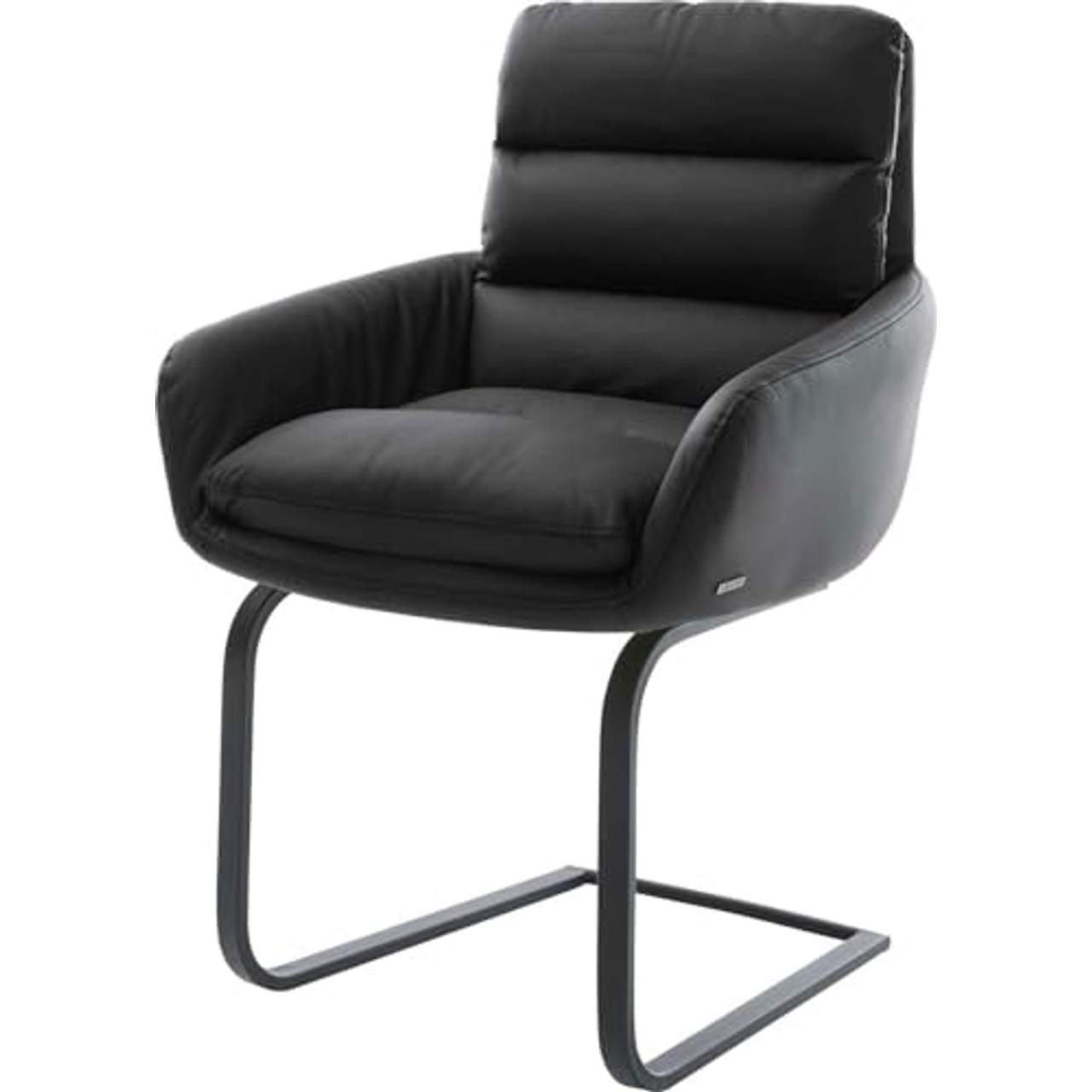 DELIFE Schwingstuhl Abelia-Flex Armlehnen Freischwinger flachDas elegante Design mit durchgehender Armlehne und der besonders hohe Sitzkomfort machen Abelia zum perfekten Stuhl für deinen Essbereich. Die Lose-Kissen-Optik sorgt nicht nur für einen einmaligen Look, sondern vor allem für gemütliche und stilvolle Stunden mit Familie und Freunden.Das hochwertige Echtleder in klassischem Schwarz begeistert durch eine besonders angenehme Geschmeidigkeit und einer außergewöhnlichen Robustheit. Esszimmerstuhl Abelia mit Armlehnen Echt-Leder Schwarz - die perfekte SitzgelegenheitDurch seine typische Freischwingerform mit einer leichten Wippfunktion macht das Stuhlgestell das Sitzen zu einen rückenschonenden Vergnügen. Durch die Verwendung von Flachstahl wirkt es besonders edel und geschmackvoll.Durch das aufwendige Verfahren der Pulverbeschichtung entsteht eine sehr regelmäßige Oberfläche, die besonders robust und widerstandsfähig gegen Kratzer und Beschädigungen ist. Dadurch lässt sich das Gestell einfach reinigen und bleibt lange schön.Maße ca.: B62 x T60 x H91 cmSitzbreite ca.: 46 cmSitztiefe ca.: 42 cmSitzhöhe ca.: 51 cmRückenhöhe ca.: 45 cmArmlehnenhöhe ca.: 63 cmMaterialen: Sitzschale: Echt-Leder (Rindleder), Stuhlgestell: pulverbeschichtetes MetallFarbe: Sitzschale: Schwarz, Stuhlgestell: SchwarzOberfläche: GlattMontagehinweis: teilmontiert, die Einzelelemente müssen miteinander verbunden werdenGewicht in kg: 16Auf Grund hochwertiger Verarbeitung belastbar bis 125 kg