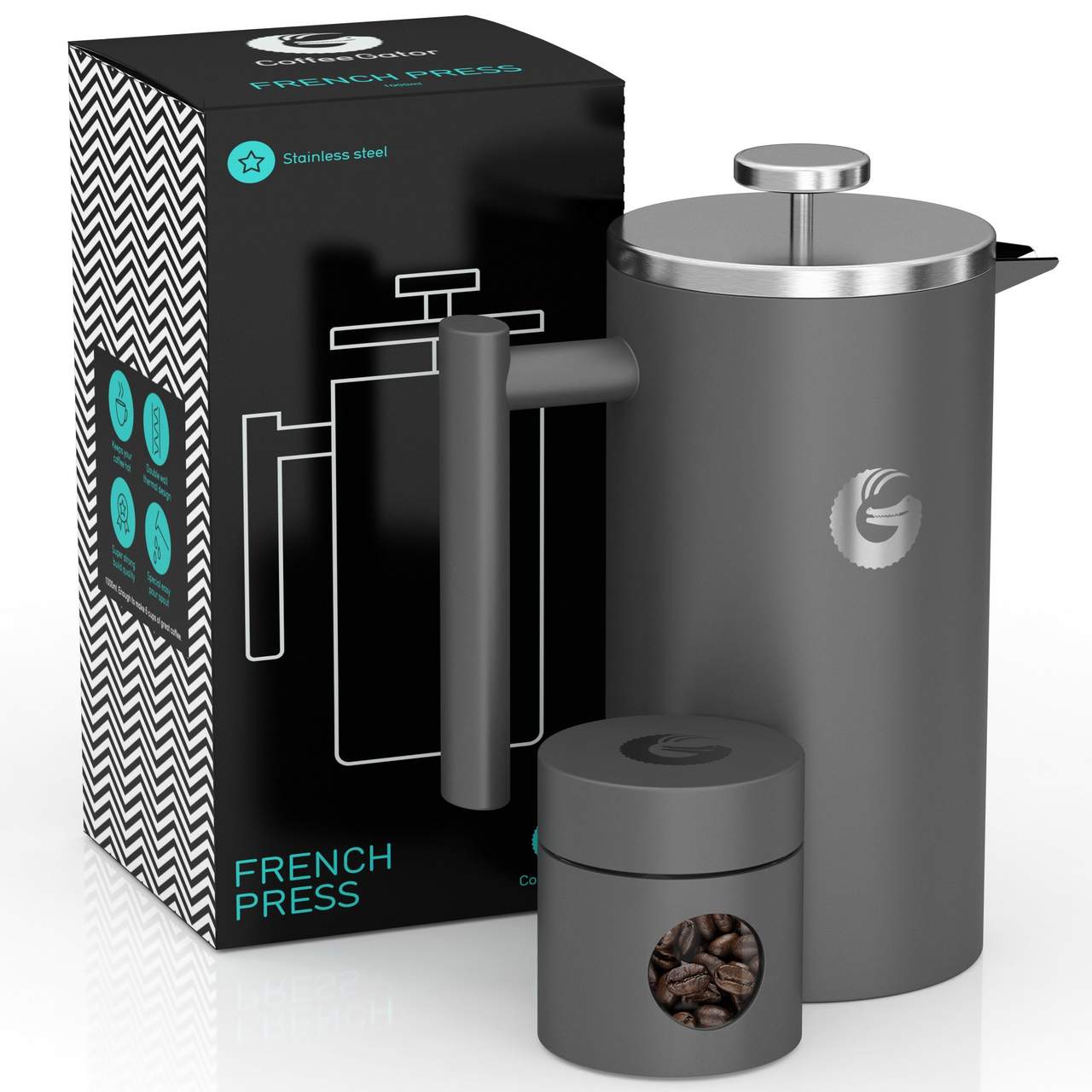 Eine der herausragenden Eigenschaften der Coffee Gator French Press ist das doppelte Filtersystem, das beim Ausgießen keine Rückstände in der Tasse hinterlässt. Außerdem erhältst du als Bonus ein kostenloses eBook mit Tipps und Tricks für die perfekte Kaffeezubereitung. Außerdem erhältst du mit deiner Bestellung eine Mini-Kaffeedose, damit du deinen Lieblingskaffee überallhin mitnehmen kannst. Diese Funktionen tragen erheblich dazu bei, das Benutzererlebnis zu verbessern, und machen sie zu einem würdigen Kandidaten, wenn du den Kauf einer French Press in Betracht ziehst.
