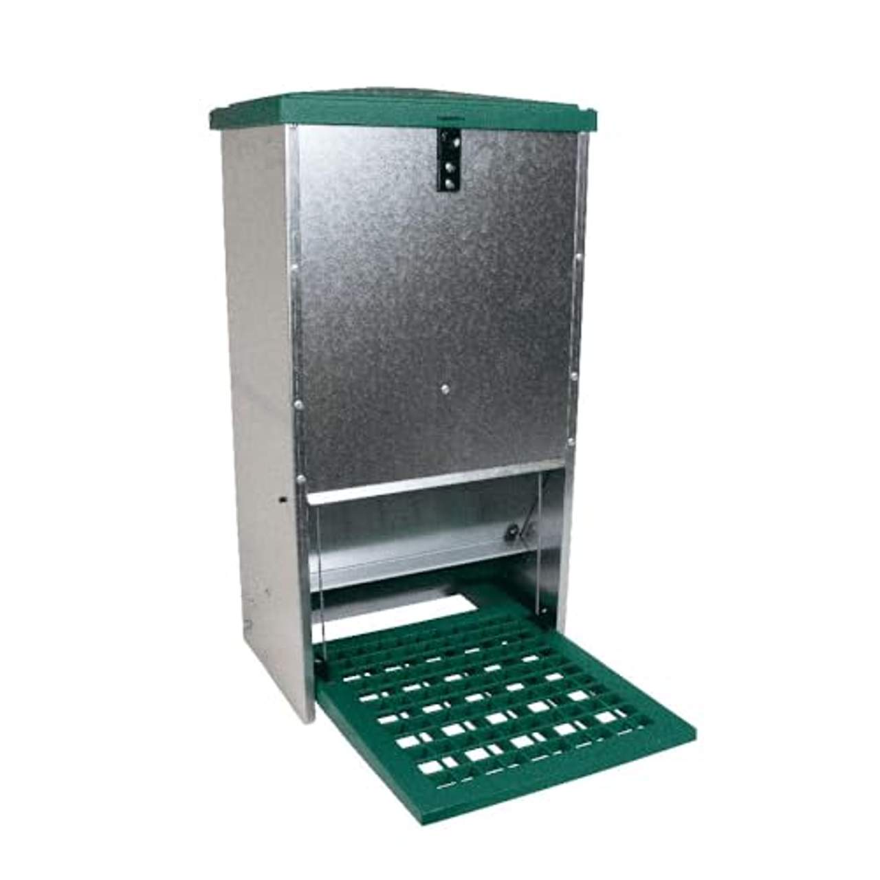 Gefluegelfutterautomat Anti-Insekt 20 kgGeflügelfutterautomat | Blech | mit Fußpedal (20 kg)Dieser Futterautomat besteht aus hochwertigem, verzinktem Blech und ist dadurch rost- und witterungsbeständig - ideal für den Außenbereich! Er verfügt über ein vor Regen schützendes System, welches das Eindringen von Wasser in das Gehäuse verhindert und somit das Futter effektiv vor Feuchtigkeit schützt. Der Automat wird mithilfe eines Klappdeckels einfach von oben befüllt.Die Öffnung zur Fütterung erfolgt über Betätigung des Pedals durch das Tier. Das Pedal besteht aus einem Kunststoffgitter, um die Reinigung zu erleichtern und die Ansammlung von Exkrementen zu verhindern. Da die Empfindlichkeit des Pedales einstellbar ist, ist dieser Futterautomat für nahezu jede Geflügelart geeignet.Dieses Modell bietet einen maximalen Schutz vor Ungeziefer, Schmutz und Feuchtigkeit! Kapazität 20 kg EIGENSCHAFTEN:Robust und witterungsbeständig dank hochwertigem, verzinktem Blech Effektiver Schutz vor Feuchtigkeit, Ungeziefer und Verschmutzungen Praktische Befüllung von oben Empfindlichkeit des Fußpedals einstellbar Leicht zu reinigen