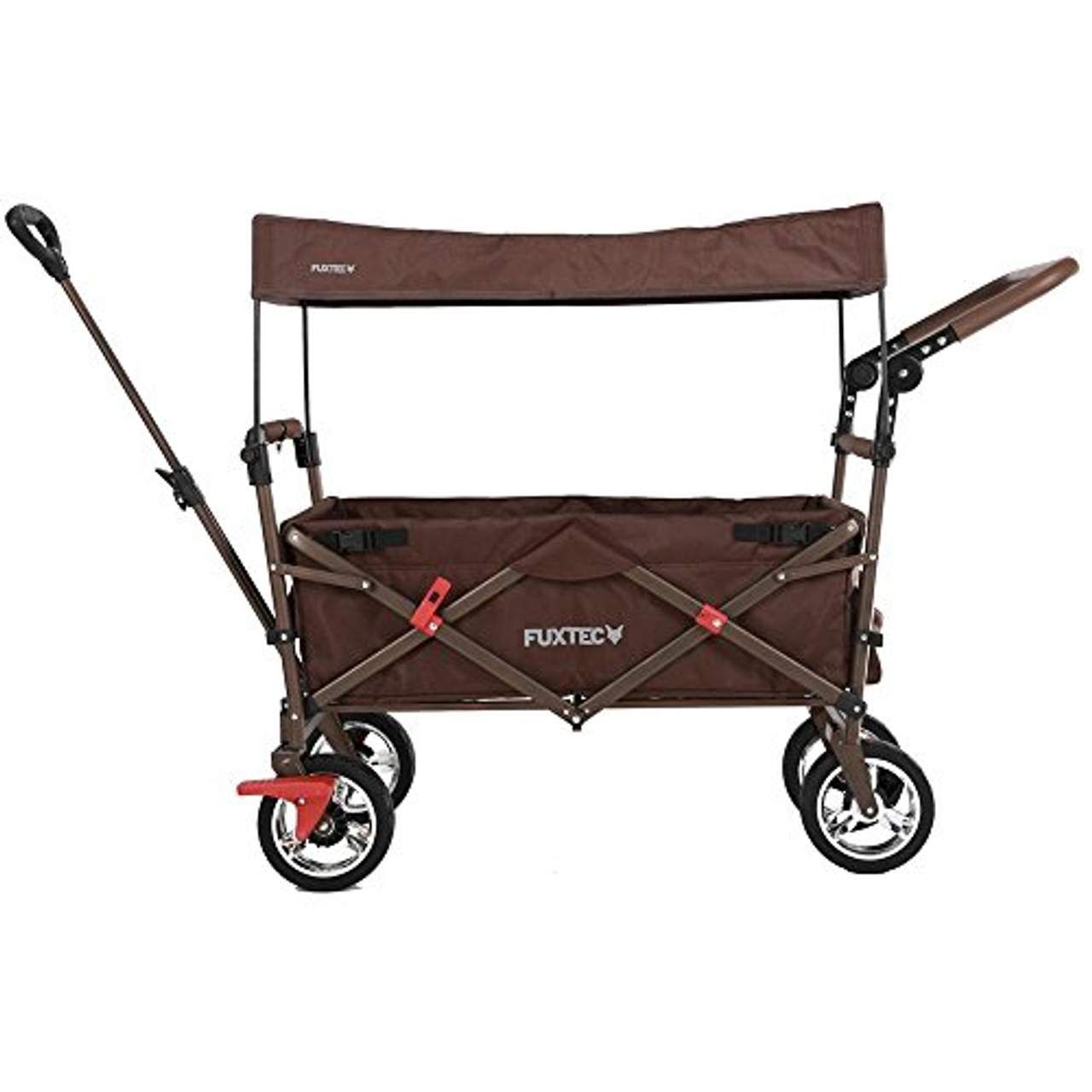Fuxtec FX-CT700Der neue Fux ist da! FUXTEC faltbarer Bollerwagen CT-700 in BRAUN mit UV-geschütztem Sonnendach, doppelter Bremsfunktion und neuem zusätzlichen Schiebegriff Erleichtern Sie sich alle Arten von Transporten mit dem neuen Bollerwagen, das ORIGINAL von FUXTEC Faltbarer Bollerwagen auf ein Mini-Maß von gerade mal 15cm Tiefe in wenigen Sekunden zusammengeklappt verstellbarer Handgriff in der Höhe zusätzlicher Schiebegriff hinten - Schiebegriff nicht zum anheben der vorderen Reifen geeignet Standhaft im zusammengeklappten Zustand - Dank der stabilen Standfüße mit unserem neuen Zweibremssystem vorne und hinten, mit Feststellbremse - Auch an Abhängen sicher stehen !!! Verchromte Felgen egal ob mit oder ohne Dach, durch ausklappbare Karbonstangen ist dies in Sekunden erledigt UV-Schutz-Sonnendach (LSF17) mit Schaumstoff gepolsterte Bodeneinlage Querstangen mit Polsterschutz Sehr belastbar mit bis zu 75kg Vielfältig nutzbar für Wanderungen, im Haus, Garten oder auf Baustellen Kippsicher auf 4 großen kugelgelagerten Rädern mit 190 mm Durchmesser Breite Räder aus Gummi mit Profil Schutzlackiertes Metal Gestell aus Stahl , NICHT aus Plastik Bereits komplett montiert !!! Ein Lichtschutzfaktor gliedert sich in den Stufen Basis (6-10), Mittel (15-25), Hoch (30-50+). Unser UV-Schutzdach hat einen Lichtschutzfaktor 17 und gliedert sich somit in der mittleren Stufe ein. Die UV-A Durchlässigkeit beträgt nur 6,63%, die UV-B Durchlässigkeit sogar nur 5,62% . Dementsprechend ist der UV-Schutz von UV-A = 93,37% und UV-B = 94,38%. Auch Komfort - Anschnallgurte für unsere Kleinen bieten wir optional an und um es unseren wichtigsten Personen gemütlich zu machen, haben wir ultra gemütliche und rückenunterstützende Bollerwagenmatten. Achtung: Abgebildete Anschnallgurte oder Hecktaschen dienen nur zur Verbildlichung und gehören nicht zum Lieferumfang, können aber optional erworben werden.Der neue faltbare Bollerwagen der CT-Serie von FUXTEC ist ein wahrer Alleskönner. Nicht nur, dass sie bis zu 75 kg Belastung tragen, sehr leicht sich lenken und ziehen lassen, man kann diese auch äußerst kompakt mit nur einem Handgriff platzsparend zusammenklappen.Gerade mal 15cm tief kann der zusammengeklappte Bollerwagen in jeden noch so kleinen Keller oder Kofferraum Ihres Autos verstaut werden. Damit eignet sich ein Bollerwagen von FUXTEC ideal für den Einsatz bei Familienausflügen, bei Arbeiten im Garten, Transportieren Ihrer Einkäufe vom Auto ins Haus oder auf der Baustelle.Natürlich begleitet er Sie auch auf Ihrer Mai-Tour zum Vatertag und ist der ideale Lastenträger für sämtliche Getränke. Wir empfehlen unsere Bollerwägen auch für den typischen Junggesellenabschied!