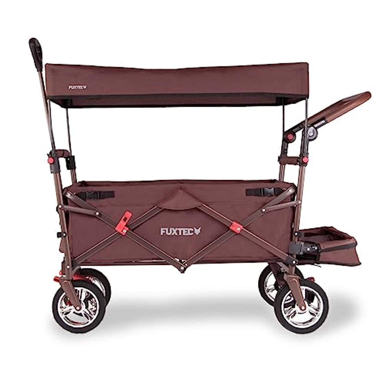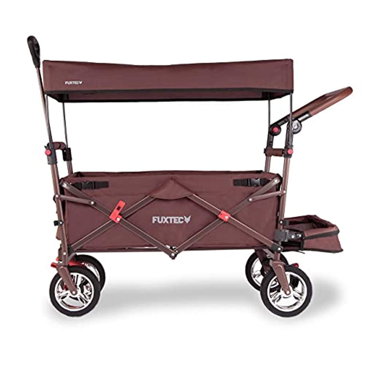 Fuxtec FX-CT800FUXTEC faltbarer Bollerwagen CT-800 mit UV-geschütztem Sonnendach, doppelter Bremsfunktion, zusätzlichem Schiebegriff und Innenraumverlängerung. Der faltbare Bollerwagen CT800 ist in den Farben Grau, Braun, Türkis/Blau, Purpur/Lila oder Rot erhältlich. Die komplette Auswahl für jeden Geschmack und das Original von FUXTEC! Erleichtern Sie sich alle Arten von Transporten mit dem neuen Bollerwagen, das ORIGINAL von FUXTEC Jetzt mit Innenraumverlängerung, noch mehr Beinfreiheit für die Kids.Für alle Beinlängen geeignet.Nicht ausgelegt für das abstellen von Taschen,Rucksäcke etc. Muss beim zusammenklappen vorher abgeklipst werden. Faltbarer Bollerwagen auf ein Mini-Maß von gerade mal 15cm Tiefe in wenigen Sekunden zusammengeklappt verstellbarer Handgriff in der Höhe zusätzlicher Schiebegriff hinten - Schiebegriff nicht zum anheben der vorderen Reifen geeignet Standhaft im zusammengeklappten Zustand - Dank der stabilen Standfüße mit unserem neuen Zweibremssystem vorne und hinten, mit Feststellbremse - Auch an Abhängen sicher stehen Verchromte Felgen egal ob mit oder ohne Dach, durch ausklappbare Karbonstangen ist dies in Sekunden erledigt UV-Schutz-Sonnendach (LSF 17) mit Schaumstoff gepolsterte Bodeneinlage Querstangen mit Polsterschutz Sehr belastbar mit bis zu 75kg Vielfältig nutzbar für Wanderungen, im Haus, Garten oder auf Baustellen Kippsicher auf 4 großen kugelgelagerten Rädern mit 190 mm Durchmesser Breite Räder aus Gummi mit Profil Schutzlackiertes Metal Gestell aus Stahl, nicht aus Plastik Bereits komplett montiert. Ein Lichtschutzfaktor gliedert sich in den Stufen Basis (6-10), Mittel (15-25), Hoch (30-50+). Unser UV-Schutzdach hat einen Lichtschutzfaktor 17 und gliedert sich somit in der mittleren Stufe ein. Die UV-A Durchlässigkeit beträgt nur 6,63%, die UV-B Durchlässigkeit sogar nur 5,62% . Dementsprechend ist der UV-Schutz von UV-A = 93,37% und UV-B = 94,38%. Auch Komfort-Anschnallgurte für unsere Kleinen bieten wir optional an und um es unseren wichtigsten Personen gemütlich zu machen, haben wir ultra gemütliche und rückenunterstützende Bollerwagenmatten. Der neue faltbare Bollerwagen der CT-Serie von FUXTEC ist ein wahrer Alleskönner.Nicht nur, dass sie bis zu 75kg Belastung tragen, sehr leicht sich lenken und ziehen lassen, man kann diese auch äußerst kompakt mit nur einem Handgriff platzsparend zusammenklappen. Gerade mal 29cm tief kann der zusammengeklappte Bollerwagen in jeden noch so kleinen Keller oder Kofferraum Ihres Autos verstaut werden.Damit eignet sich ein Bollerwagen von FUXTEC ideal für den Einsatz bei Familienausflügen, bei Arbeiten im Garten, Transportieren Ihrer Einkäufe vom Auto ins Haus oder auf der Baustelle. Natürlich begleitet er Sie auch auf Ihrer Mai-Tour zum Vatertag und ist der ideale Lastenträger für sämtliche Getränke.Wir empfehlen unsere Bollerwägen auch für den typischen Junggesellenabschied!