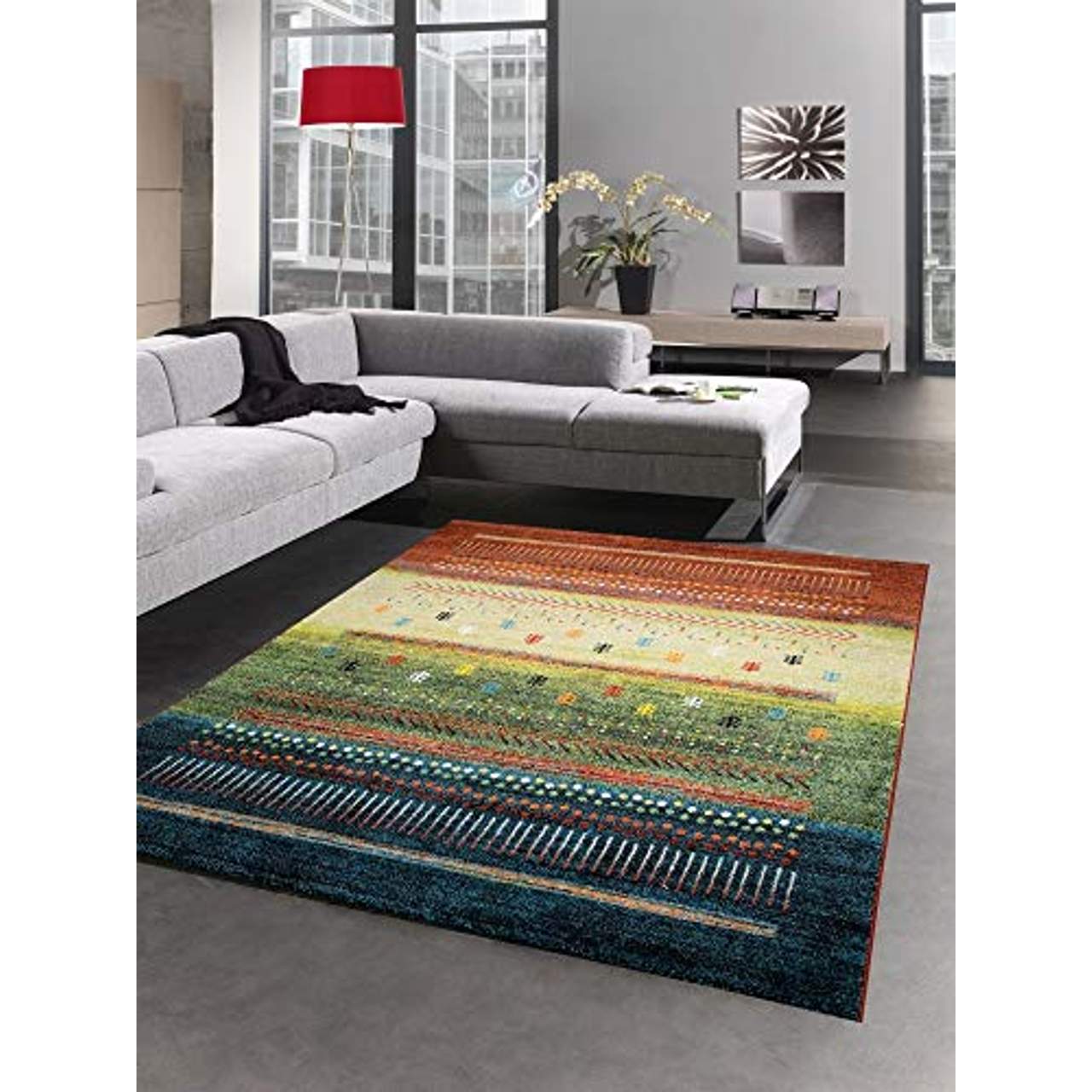 CARPETIA Klassicher Teppich Gabbeh Kelim Kurzflor Teppich buntDer gewebte Teppich überzeugt durch seine schöne und grafische Musterung. Sie möchten einen modernen Akzent in Ihrem Wohnzimmer, in Ihrem Schlafzimmer, in der Küche oder im Flur setzen! Dann entscheiden Sie sich für unsere modernen oder Designer Teppiche aus unserer aktuellen Kollektion.Der maschinell gefertigte Teppich bietet eine elegante Optik, die das Wohnambiente dezent unterstreicht. Zudem ist er aus schmutzabweisenden Material gefertigt und sehr strapazierfähig. Die pflegeleichte und allergikerfreundliche Eigenschaft macht den Teppich zu einem alltagstauglichen Wohnaccessoire. Der Teppich ist auch für Böden mit integrierter Fußbodenheizung geeignet.Die Teppiche gibt es in unterschiedlichen Größen und damit passend für jedes Zimmer. Technische Daten: Fußbodenheizung geeignet Sehr strapazierfähig Allergiker geeignet Hautsympathisch Pflegeleicht Schmutzabweisend Teppich Farbe: grün, rot, gelb, türkis, bunt Maschinengewebt 3 kg/m² Gesamtgewicht (ca.) 13 mm Gesamthöhe (ca.) 100 % Merilon Friese, Polypropylen