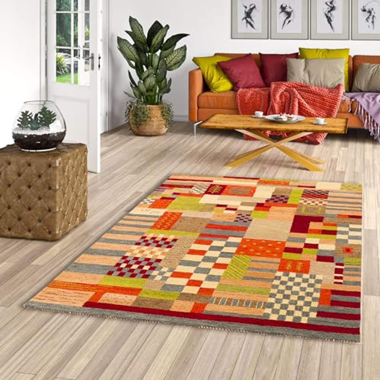 - Langlebige Qualität: Der Theko Natur Teppich Indo Gabbeh Esta Bunt Felder besteht aus 100% Schurwolle und hat eine Gesamthöhe von ca. 20 mm, was ihn sehr strapazierfähig und langlebig macht.
