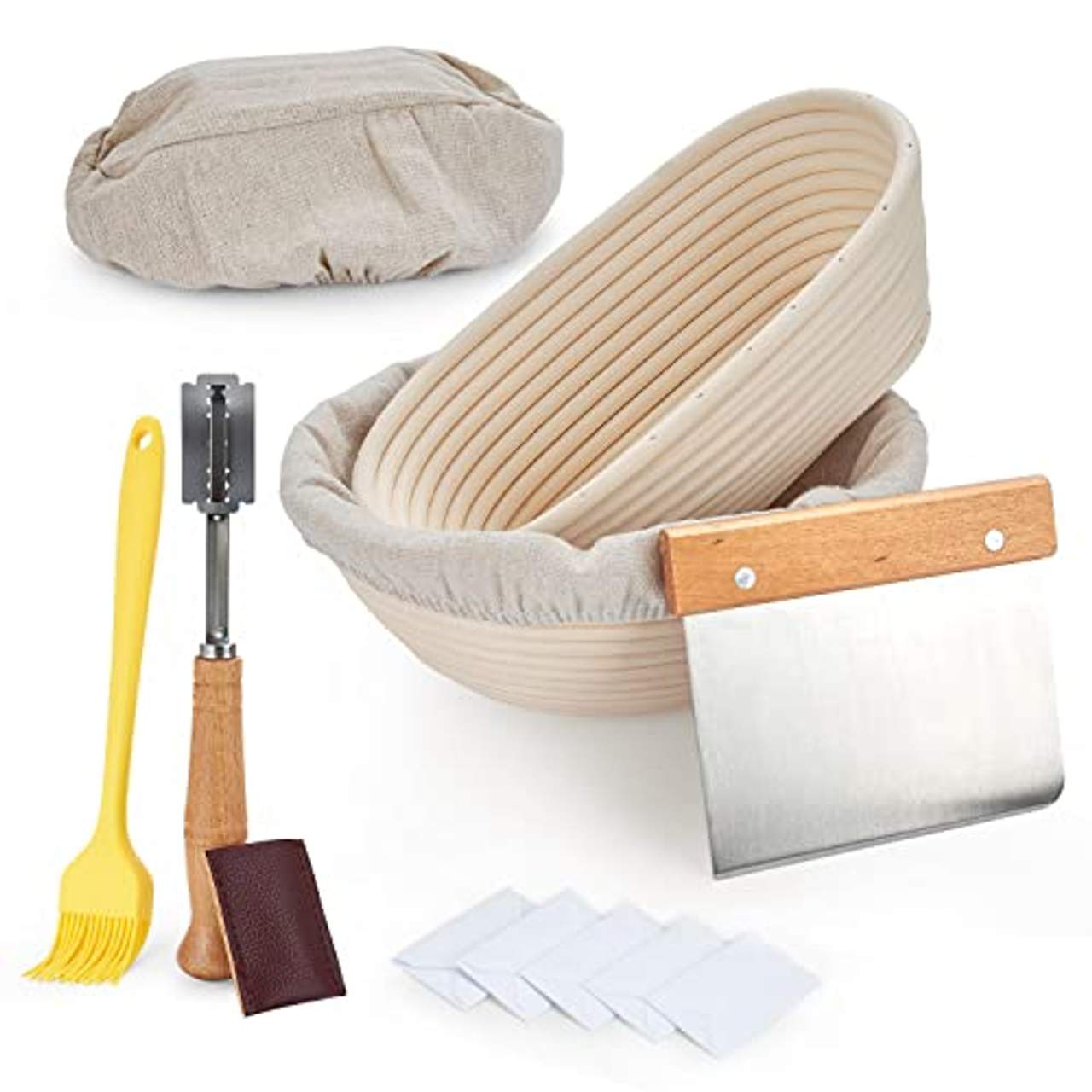 Das Ohuhu Gärkorb-Set enthält eine vielseitige Reihe von Werkzeugen für die Brotherstellung, darunter einen ovalen Korb mit Stoffbezug, einen runden Korb mit Stoffbezug, ein Bäckermesser mit fünf Klingen, einen Schaber und eine Bürste.