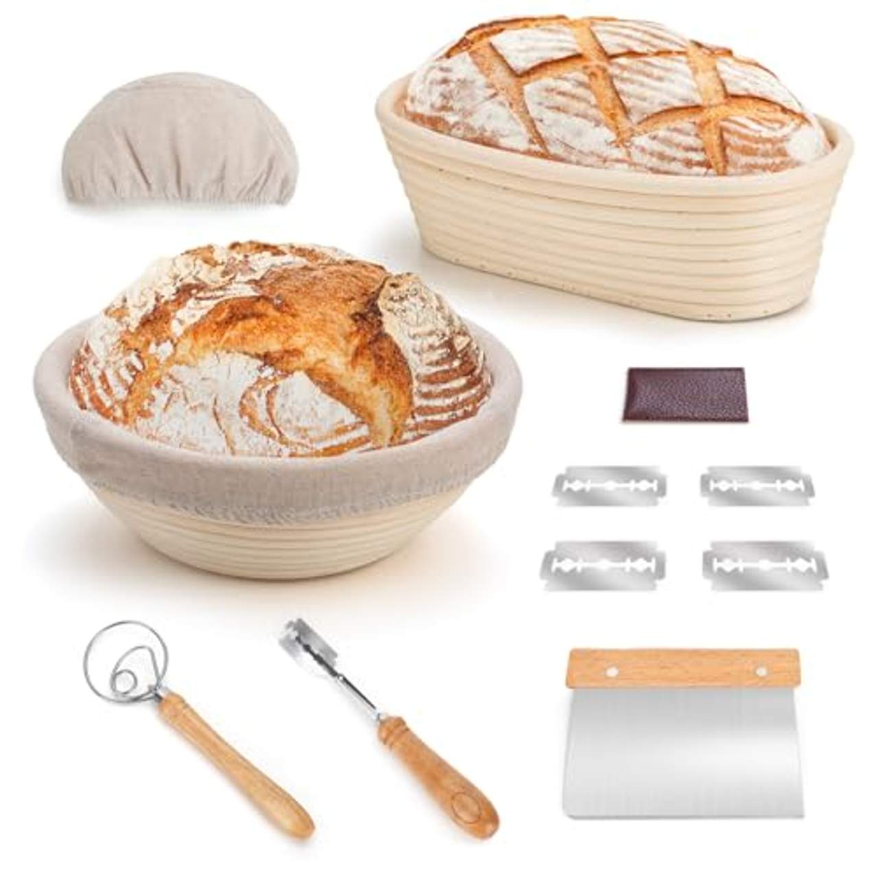 Zusätzlich zu den Körben enthält dieses Backset auch einen Schneebesen, der perfekt ist, um deinen Teig gleichmäßig zu verrühren. Außerdem enthält es einen Teigschaber für eine einfache Handhabung und Formgebung, zwei Leinentücher zum Abdecken des Teigs während der Gärung und eine Brotlamme mit fünf zusätzlichen Klingen zum Einritzen schöner Muster auf dem Brot.