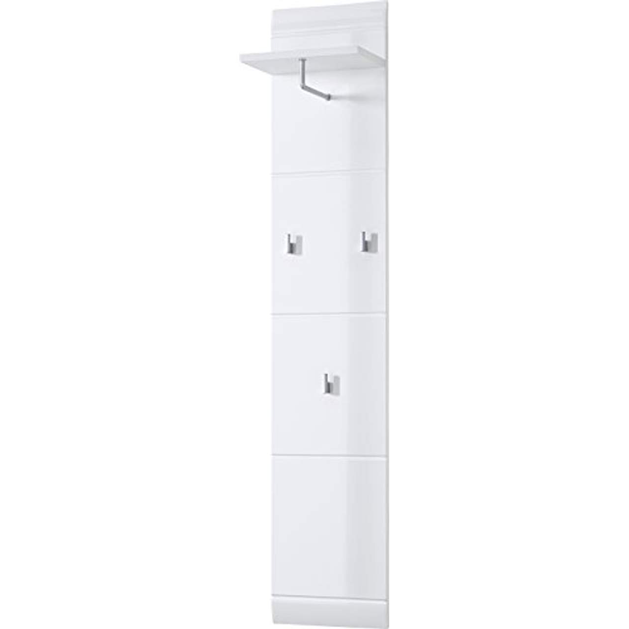Germania 3526-84 Garderobenpaneel GW-Adana in Weiß HochglanzGarderobenpaneel mit 1 Ablageboden, 1 Kleiderstange und 3 Kleiderhaken, Korpus MDF Hochglanz mit Rillenfräsung In folgenden Farben erhältlich: Korpus/Front: weiß, Korpus/Front: eichefarben Sonoma, Korpus/Front: edelbuchefarben, Farbe Haken: alufarben. Details: Inkl. Montagematerial, Hutboden, 1 Kleiderstange, 3 Haken, Hängende Montage, Made in Germany. Gesamtmaße: Gesamtmaße (B/T/H): 30/23/152 cm. Material: Korpus: MDF, Haken aus Kunststoff. Informationen zu Lieferumfang und Montage: Inklusive Kleiderhaken, Inklusive Material zur hängenden Montage, Selbstmontage mit Aufbauanleitung, Alles ca.-Maße. Unsere Tipps für Sie: Durch helle Farbtöne wird der Flur optisch gestreckt und bekommt so mehr Weite., Garderobenständer und Wandgarderoben sind eine alternative Aufbewahrungsmöglichkeit für Jacken, wenn ein Garderobenschrank nicht in Ihren Flur passt…Pflegehinweise: Pflegehinweise für Möbel aus Holzwerkstoffen (inklusive Melamin und MDF):Verwenden Sie zur Pflege Ihrer Möbel aus Plattenwerkstoffen am besten ein weiches, nicht fusselndes Tuch oder ein Ledertuch. Wischen Sie die Oberflächen leicht feucht ab…