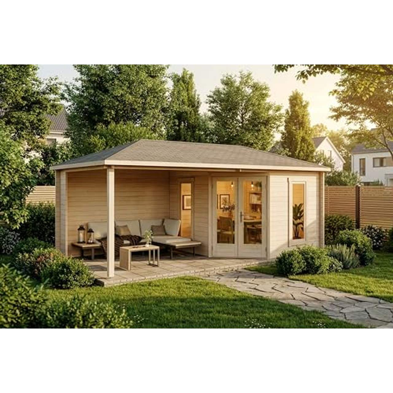 - Gemütliches Outdoor-Erlebnis: Die einzigartigen Designelemente des Liwa-28, wie das Walmdach und die überdachte Terrasse, schaffen eine einladende Atmosphäre für Zusammenkünfte mit Familie und Freunden im Freien. Die raumhohen Fenster lassen nicht nur natürliches Licht in den Innenraum, sondern bieten auch einen schönen Blick auf die umliegende Gartenlandschaft, was die Entspannung in dieser gemütlichen Umgebung noch verstärkt. Ob du die Sonne genießt oder bei leichtem Regen Schutz suchst, du kannst deine Zeit im Freien genießen und dabei von Komfort und Stil in deinem Außenbereich profitieren.
