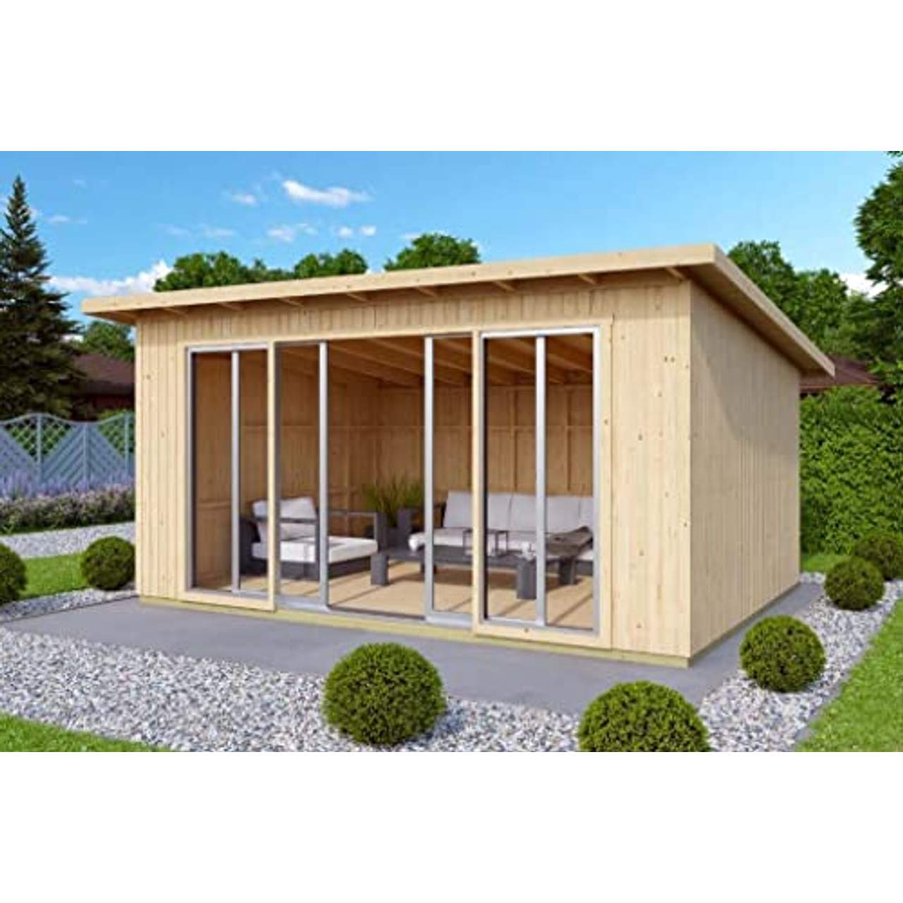 Alpholz Gartenhaus Johanna mit Schiebetür aus Massiv-HolzGartenhaus Johanna aus komplett ab Werk zusammengestellten Wand-Elementen. Hochwertige Aluminium-Schiebetür wird mit professionellen Schienen (Monosilent) geliefert. Artikelbeschreibung: Außenmaß: 436 x 337 cm Innenmaß: 423 x 324 cm Grundfläche: 14,4 m² Rauminhalt: ca. 28,21 m³ Gesamthöhe: ca. 259 cm Seitenwandhöhe: ca. 204 cm Schiebetür: ca. 160 x 205 cm 4x feststehendes Fenster: 40 x 134 cm Dachüberstände vorne/seitlich/hinten: 34/23/22 cm Dachfläche: 19 m² Dachneigung: 7° Wandstärke: 19 mm Elementbauweise Verpackungseinheit: B 480 x T 110 x 87 cm / 715 kg Im Lieferumfang enthalten: Bausatz in stabiler Elementbauweise Massivholzdach mit 19 mm Massivholzbretter hochwertige Aluminium-Schiebetür auf professionellen Schienen (Monosilent) inkl. imprägnierte Fundamenthölzer 44 x 94 mm und 19 mm Holzfußboden (naturbelassen) Lieferung in nordischer Fichte, naturbelassen (ohne Farbbehandlung) Verglasung der Türen mit 6 mm Isolierverglasung Schloss, Griffmuschel & Montagematerial Lieferung
