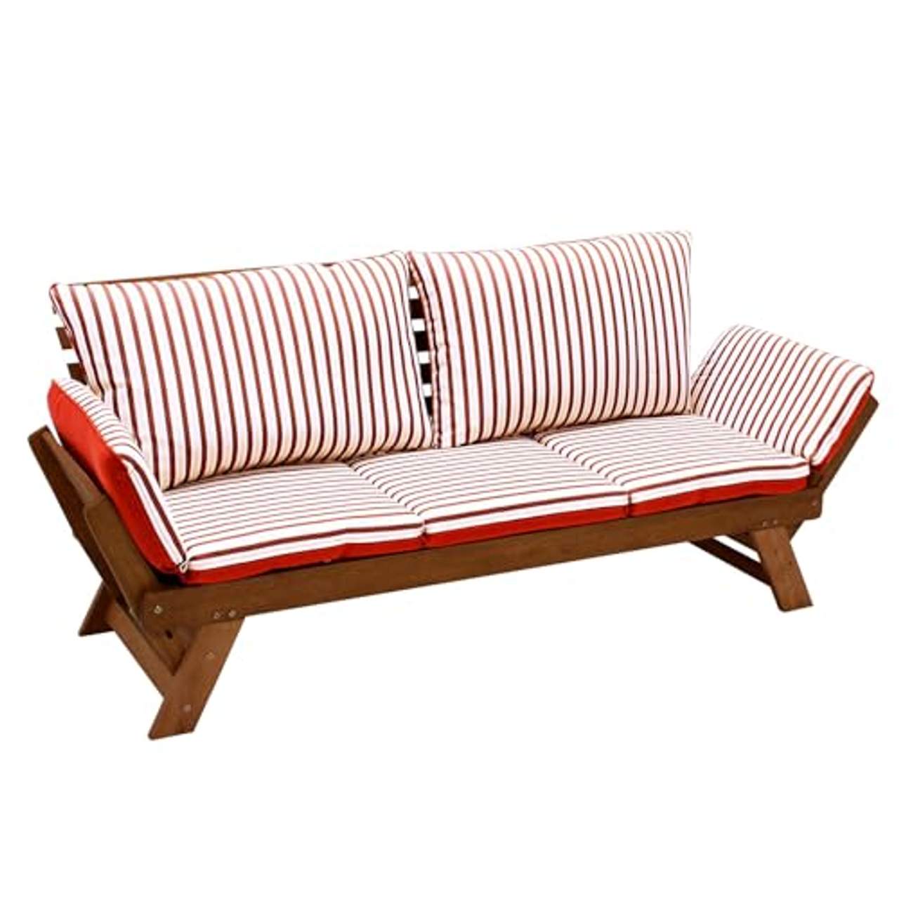 Eukalyptus Holz braucht nicht mit einer Farbe oder Holzlasur nachgestrichen zu werden, nachölen mit einem Pflegeöl genügt. Eine detaillierte Anleitung mit Pflegetipps ist im Lieferumfang enthalten.Im Lieferumfang ist ebenfalls eine 7cm dicke Wendeauflage und Rückenkissen enthalten. Eine Seite ist rot/beige gestreift, die andere rot unifarben.Materialzusammensetzung Bezüge: 100% Polyester.Maße: Breite als Sofa: 165cm, Breite als Liege (Seitenlehnen nach unten geklappt): 202cm, Tiefe: 69cm, Höhe: 77cm, Sitzbreite: 150cm, Länge Liegefläche (Seitenlehnen nach unten geklappt): 202cm, Sitztiefe 53cm, Sitzhöhe 30cm (ohne Polster), Dicke Polster: 7cm, Rückenhöhe 49cm