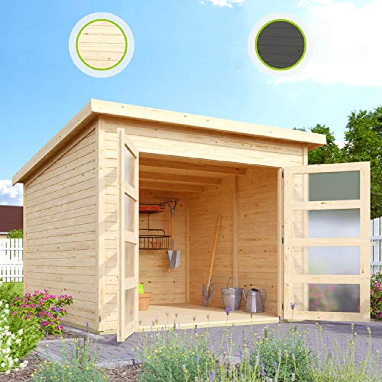 - Attraktive Ästhetik: Dieses Gartenhaus besticht durch seine attraktive Ästhetik mit dem Systemhaus aus nordischer Fichte mit Pultdach - Paneelen und Türgröße 182 x 187 cm mit eingesetztem Milch-Kunstglas.