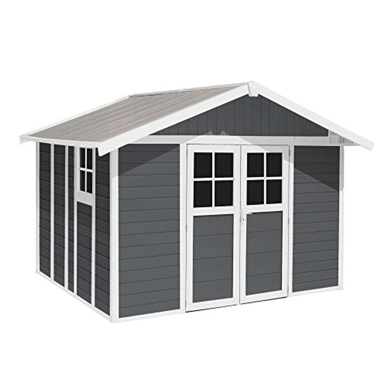 Ondis24 Gartenhaus Deco H 11 dunkelgrau weißDas Gartenhaus ist aus witterungs- und kältebeständigem, hochwertigem PVC Kunststoff gefertigt und metallverstärkt. Somit ist es nahezu unverwüstlich, wetterfest und langlebig. Das Haus ist mit zwei abschließbare Flügeltüren und einem seitlichen Fenster ausgestattet. Im Eingangsbereich ist die Türschwelle extra flach, damit Sie zum Beispiel Ihren Rasenmäher oder eine Schubkarre problemlos herein- und herausfahren können.