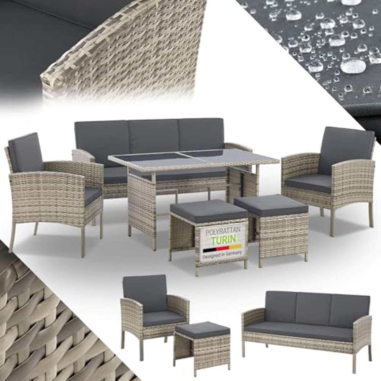 Juskys Polyrattan Gartenmöbel Sitzgruppe Turin Set 6 teiligDie stylishe Polyrattan Gartenmöbel Sitzgruppe Turin in grau-meliert für 7 Personen wird zu Ihrem neuen Lieblingsplatz. Sie eignet sich perfekt für den Balkon oder die Terrasse. Ganz gleich, ob Sie einen entspannten Abend ausklingen lassen oder einfach nur chillen möchten, das Set bietet einen bequemen Platz mit den dicken Auflagen.Verbringen Sie eine schöne Zeit auf der modernen Lounge mit Familie und Freunden.Produktmerkmale:Moderne Gartenlounge für bis zu 7 PersonenKomplettes Set mit 2 Stühlen, Sitzbank, Tisch &, 2 HockernBequeme Kissen mit waschbaren Stoff-BezügenPolyrattan-Geflecht - langlebig, pflegeleicht &, wetterfestGroßer Tisch mit edler Glasplatte für Speisen &, GetränkeModernes Gartenset 6-teiligDie 3-Sitzer Bank und die zwei Stühle der Garnitur bieten genug Platz für Sie und Ihre Gäste. Die zwei Hocker runden das Set ab – perfekt zum Füßehochlegen.Stabiles Polyrattan-GeflechtDas stylishe Loungemöbel besteht aus Polyrattan, das nicht nur langlebig ist, sondern auch pflegeleicht und wetterfest. Also ideal für draußen im Garten geeignet.Mit bequemen AuflagenDamit Sie es so gemütlich wie möglich auf dem Balkonmöbel haben, sind die Polster mit Schaumstoff gefüllt.Die Bezüge aus angenehmem Stoff sind waschbar.Großer Tisch mit GlasplatteDie Tischplatte aus gehärtetem Glas verleiht dem Gartenmöbelset einen eleganten Look. Platzieren Sie hier Snacks und Getränke, während Sie die Sonne genießen.Technische Daten:Farbe Sitzgarnitur: grau-meliert, Bezüge: Hellgrau, Glas: SchwarzAnzahl Sitzplätze:7Belastbarkeit: 480 kg Bank, 160 kg je Stuhl &, HockerKissenbezüge: Abnehmbar &, waschbarMaterialzusammensetzung:Geflecht: PolyrattanTischplatte: Gehärtetes GlasGestell: StahlBezüge: 100 % PolyesterPolster: 80 % Schaumstoff, 20 % WeichfasernAbmessungen (ca.-Angaben):Gartenstuhl (BxTxH): 59 x 62 x 79 cmHocker (BxTxH): 41 x 41 x 37 cmEsstisch (BxTxH): 120 x 70 x 66 cm3-Sitzer-Bank (BxTxH): 160 x 62 x 79 cmSitzhöhe ohne Polster: 36 cmDicke der Sitzpolster: 5 cmHinweise:Hinweis: Das Produkt ist wetterfest. Vermeiden Sie jedoch direkte Sonneneinstrahlung und hohe Feuchtigkeit über einen längeren Zeitraum.Lieferumfang:2 x Stuhl2 x Hocker1 x Gartentisch mit Glasplatte1 x Gartensofa5 x Sitzauflagen5 x Rückenkissen1 x AnleitungDas Produkt wird gut verpackt als Bausatz zur Selbstmontage per Paketdienst geliefert.Die Lieferung besteht aus mehreren Sendungen. Dies kann zu zeitverzögerten Zustellungen führen.