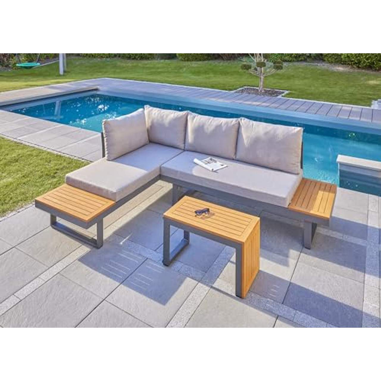 - Langlebige Materialien: Das LC Garden "Sungardo" Gartenlounge Set Anthrazit besteht aus hochwertigem pulverbeschichtetem Aluminium und massivem Akazienholz und ist so konstruiert, dass es verschiedenen Witterungsbedingungen standhält, ohne seine strukturelle Integrität zu verlieren. Die rostbeständigen Eigenschaften des Aluminiums sorgen für Langlebigkeit, während das robuste Akazienholz sowohl Stärke als auch Ästhetik bietet. Diese Langlebigkeit führt dazu, dass die Möbel seltener ausgetauscht oder repariert werden müssen, was denjenigen, die ein zuverlässiges Outdoor-Möbelset wollen, das auch im Laufe der Zeit schön bleibt, ein gutes Gefühl gibt.