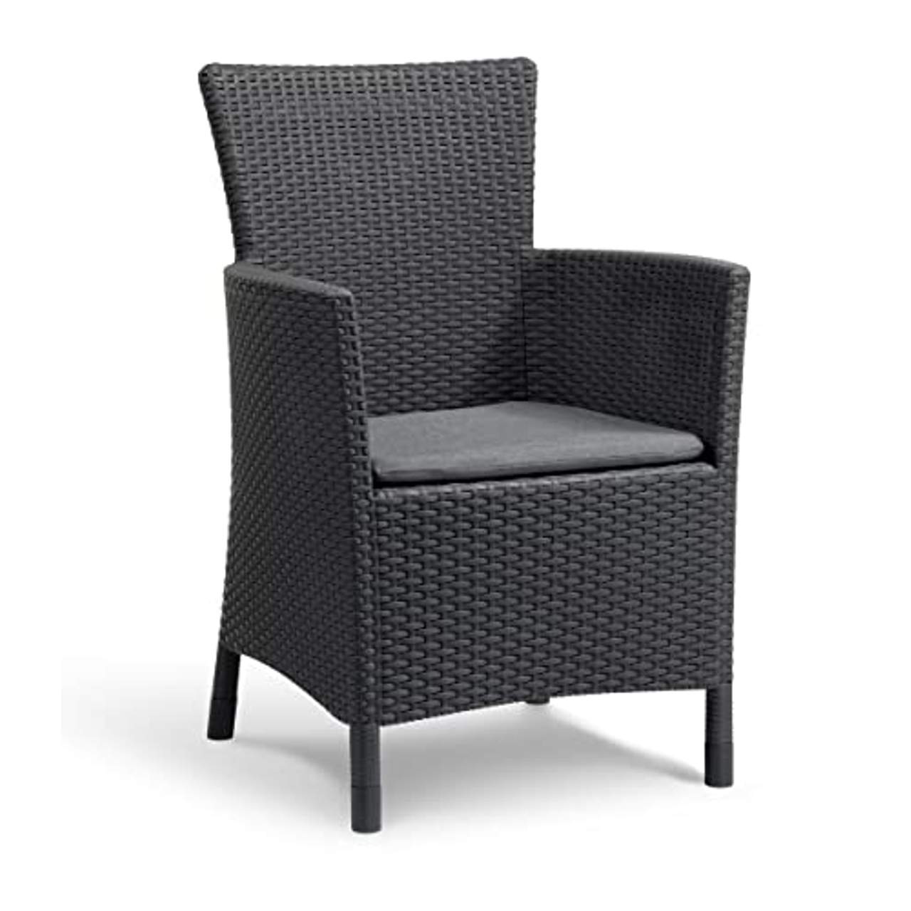 "Allibert by Keter" Gartensessel IowaMit diesem luxuriösen Allibert Iowa Gartenstuhl können Sie lange Sommernachmittage und -abende in Ihrem Garten, auf dem Balkon oder der Terrasse genießen. Der Stuhl hat bequeme Armlehnen und eine ergonomisch geformte Rückenlehne für hohen Sitzkomfort. Ein passendes Kissen ist im Lieferumfang enthalten.Dieser bequeme Gartenstuhl ist aus verschleißfestem, wetterbeständigem und wartungsfreiem Kunststoff gefertigt. So hält er jahrelang, ohne zu verschleißen oder zu rosten. Mit seinem modernen Design passt der Gartenstuhl zu jedem Gartenmöbel-Set und jedem Tisch im Freien.Allibert ist Teil eines weltweit operierenden Unternehmens, das ein umfassendes Sortiment an Möbeln, Aufbewahrungsartikeln und Organisationslösungen anbietet. Alles nachhaltig produziert, praktisch wartungsfrei und recycelbar, und natürlich ist auch für Komfort und eine schöne Optik gesorgt!Farbe: GraphitgrauMaterial: Kunststoff PPPolstermaterial: PolyesterStuhlmaße: 60 x 62 x 89 cm (B x T x H)Sitzhöhe: 50,4 cmSitztiefe: 46,7 cmArmlehnenhöhe: 64,9 cmMaximale Nutzlast: 110 kgEinfacher ZusammenbauEinfach zu reinigenFlaches Rattan 7 mmIdeal für den Einsatz im Innen- und AußenbereichUV- und witterungsbeständigLieferumfang: SitzkissenMaterial: Polypropylen: 100% 408944 Weitere Hinweise Stuhlmaße: 60 x 62 x 89 cm (B x T x H) Inklusive Sitzkissen Farbe: Graphitgrau Material: Kunststoff PP Polstermaterial: Polyester Stuhlmaße: 60 x 62 x 89 cm (B x T x H) Sitzhöhe: 50,4 cm