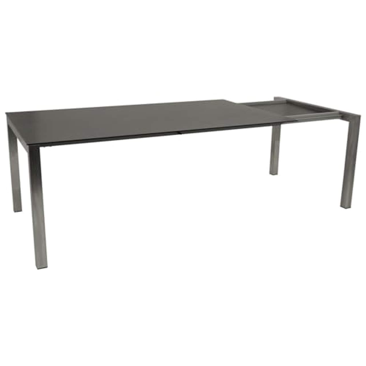 DEGAMO Gartentisch Ausziehtisch SydneyGartentisch SYDNEY – Stilvoll, langlebig, wetterfest Verwandeln Sie Ihren Garten oder Ihre Terrasse in eine stilvolle Wohlfühloase mit dem exklusiven Gartentisch SYDNEY. Sein elegantes Design vereint modernes Understatement mit hochwertigen Materialien, die für Langlebigkeit und Wetterbeständigkeit sorgen. Das robuste Gestell aus rostfreiem, gebürstetem Edelstahl bietet Stabilität und eine edle Optik, während die 10 mm starke Tischplatte aus Sicherheitsglas mit 3D-Keramikoptik in Anthrazit natürliche Eleganz ausstrahlt.Mit großzügigen Maßen von 180x100cm (ausziehbar auf 240cm) und einer angenehmen Höhe von 74 cm lädt der Tisch zu geselligen Stunden im Freien ein – egal ob beim Frühstück in der Morgensonne oder beim entspannten Abendessen mit Freunden. Der Tisch verfügt über einen Seitenauszug, so sind die Tischbeine immer an der Seite und stören nicht beim Gebraucht. Das Verlängerungselement wird einfach unter die Tischplatte geschoben und ist so bei Nichtgebrauch immer gut verstaut.