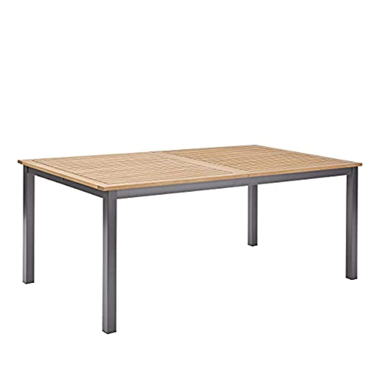 - Langlebiges Design: Dieser Gartentisch ist mit einer grauen Aluminiumstruktur ausgestattet, die eine hohe Witterungsbeständigkeit und eine bessere Haltbarkeit garantiert. Die Platte aus Eukalyptus, einem exotischen Holz, ist ebenfalls für den täglichen Gebrauch im Freien geeignet.
